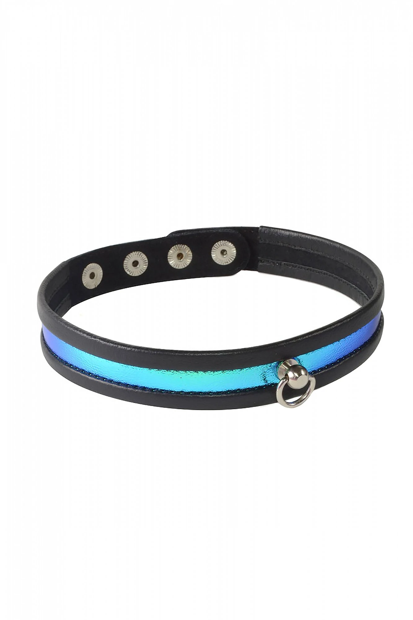 Узкий ошейник чокер от Ситабелла – это яркий и стильный аксессуар ролевых игр, который обязательно украсит Вашу шею, сделав образ более эротичным и вожделенным. Ошейник – это атрибут подчинения, поэтому одев его, отдаётесь во власть партнёра, который будет нести ответственность за Вашу безопасность и удовольствие. Основа ошейника изготовлена из натуральной чёрной кожи. Необычности ошейнику придаёт голографическая отделка, основными цветами которой являются, синий, изумрудный, бирюзовый, переливы которых образуют богатый колорит с промежуточными оттенками. Комфортное ношение обеспечивают округлые края изделия, обработанные оторочкой. Зафиксировать ошейник и отрегулировать размер можно при помощи кнопок. Вся металлическая фурнитура имеет никелевое покрытие.Размер: общая длина 41 см, ширина ремешков 2 см.