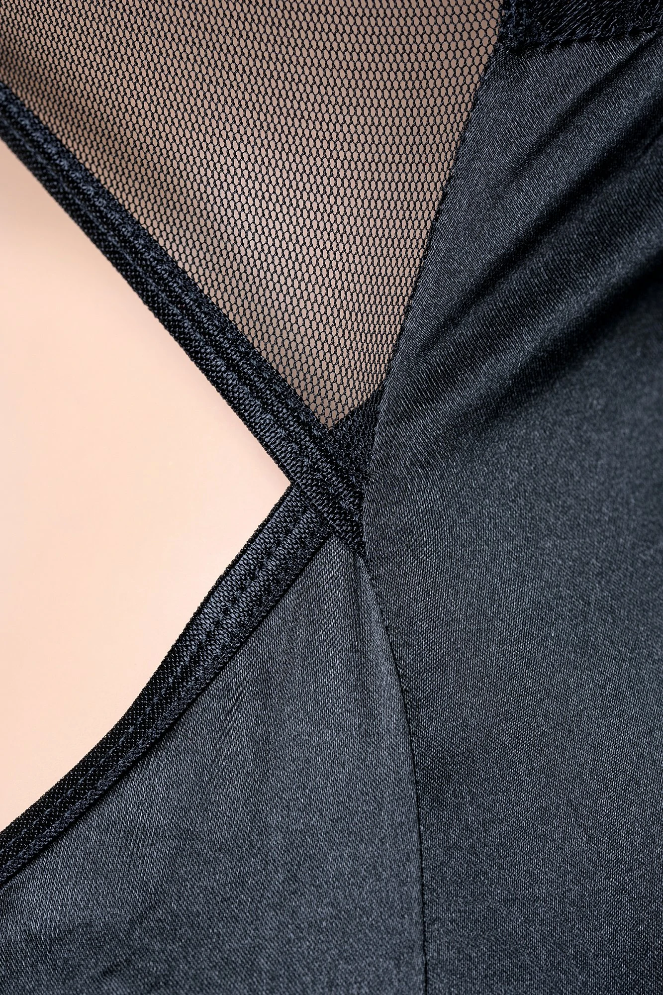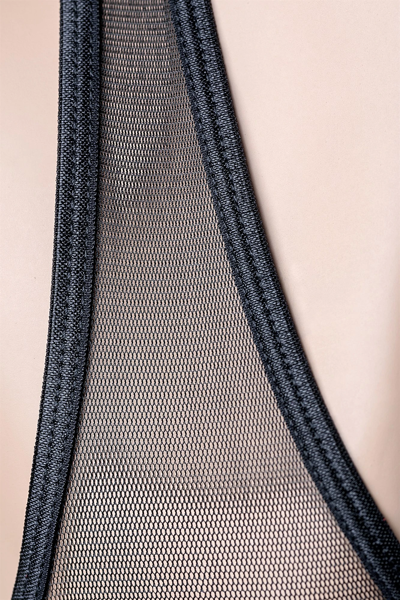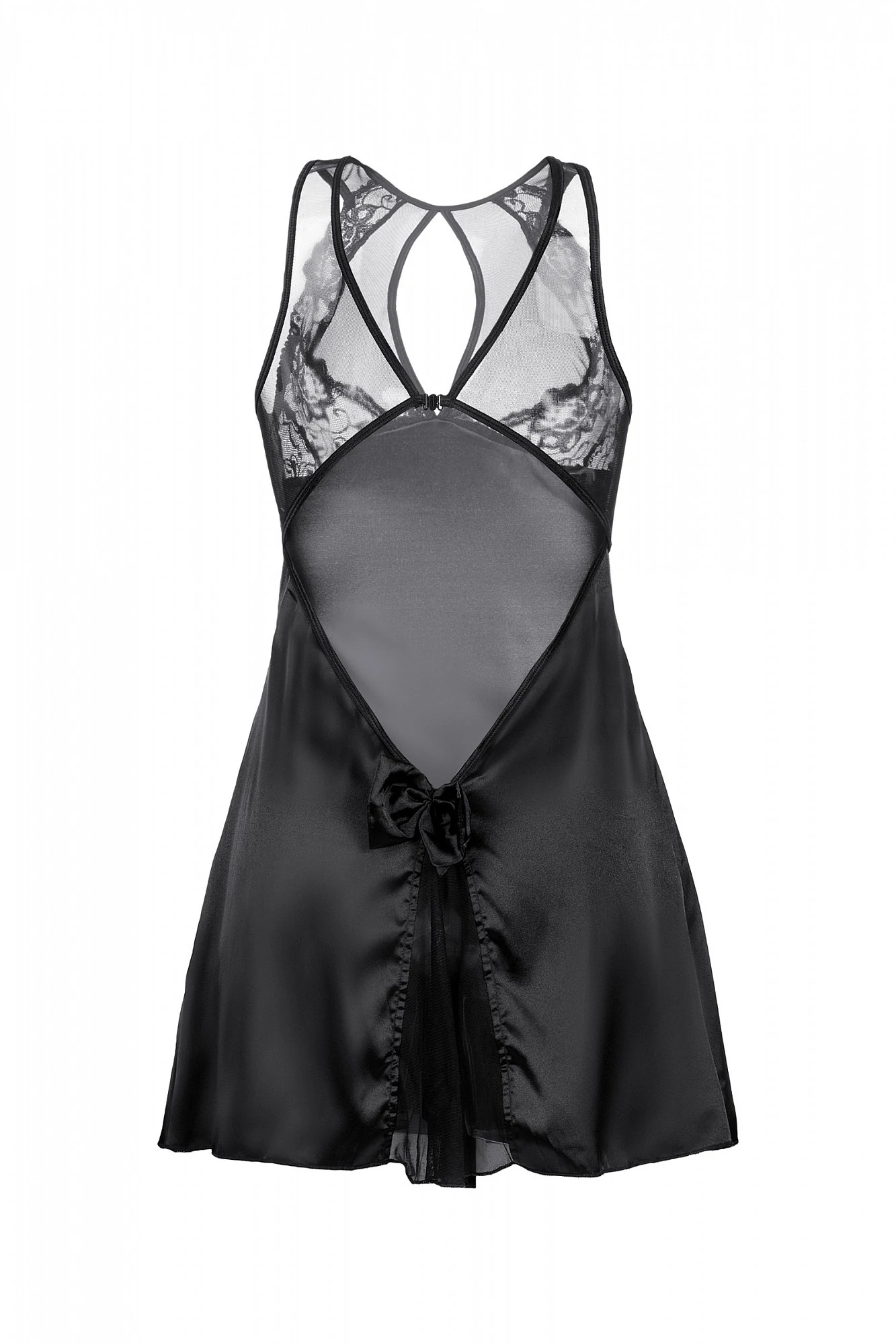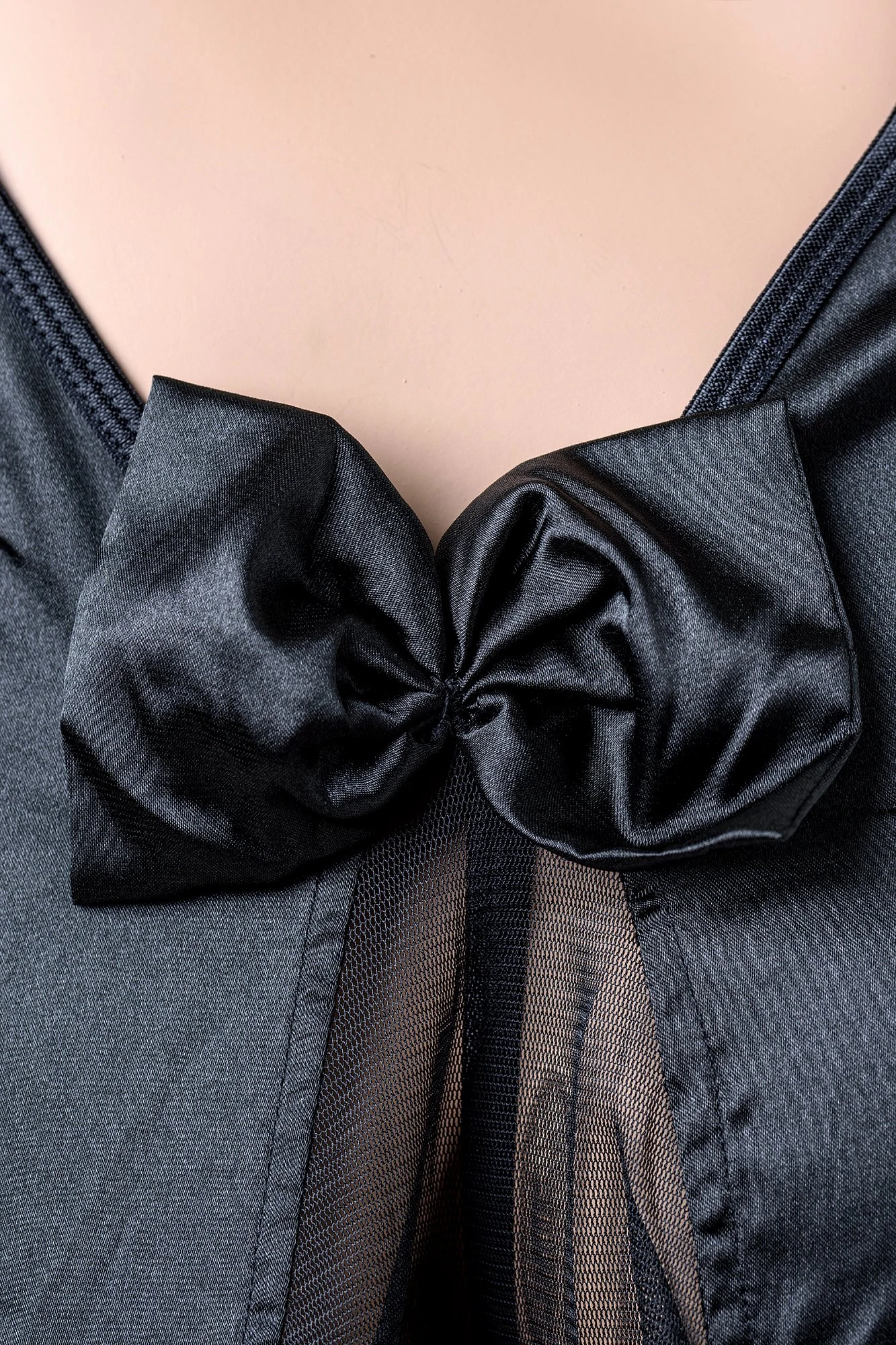 Комбинация с застежкой на спинке. Бюст выполенен из эластичной сеточки и украшен кружевом. Прозрачная вставка сзади и бантик. Стринги в комплекте. Размер: универсальный. Цвет: черный.