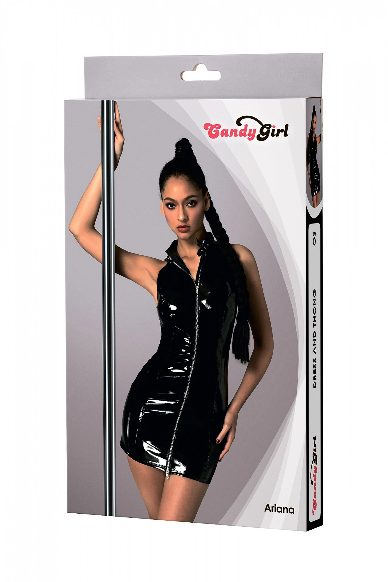Облегающее лаковое платье Ariana от Candy Girl с воротником-стойкой привлекает внимание к каждому движению даже в полумраке. Двухсторонняя металлическая молния не только зрительно вытягивает силуэт, но и позволяет избавиться от платья в считанные мгновения. Подходящие стринги идеально дополняют комплект.