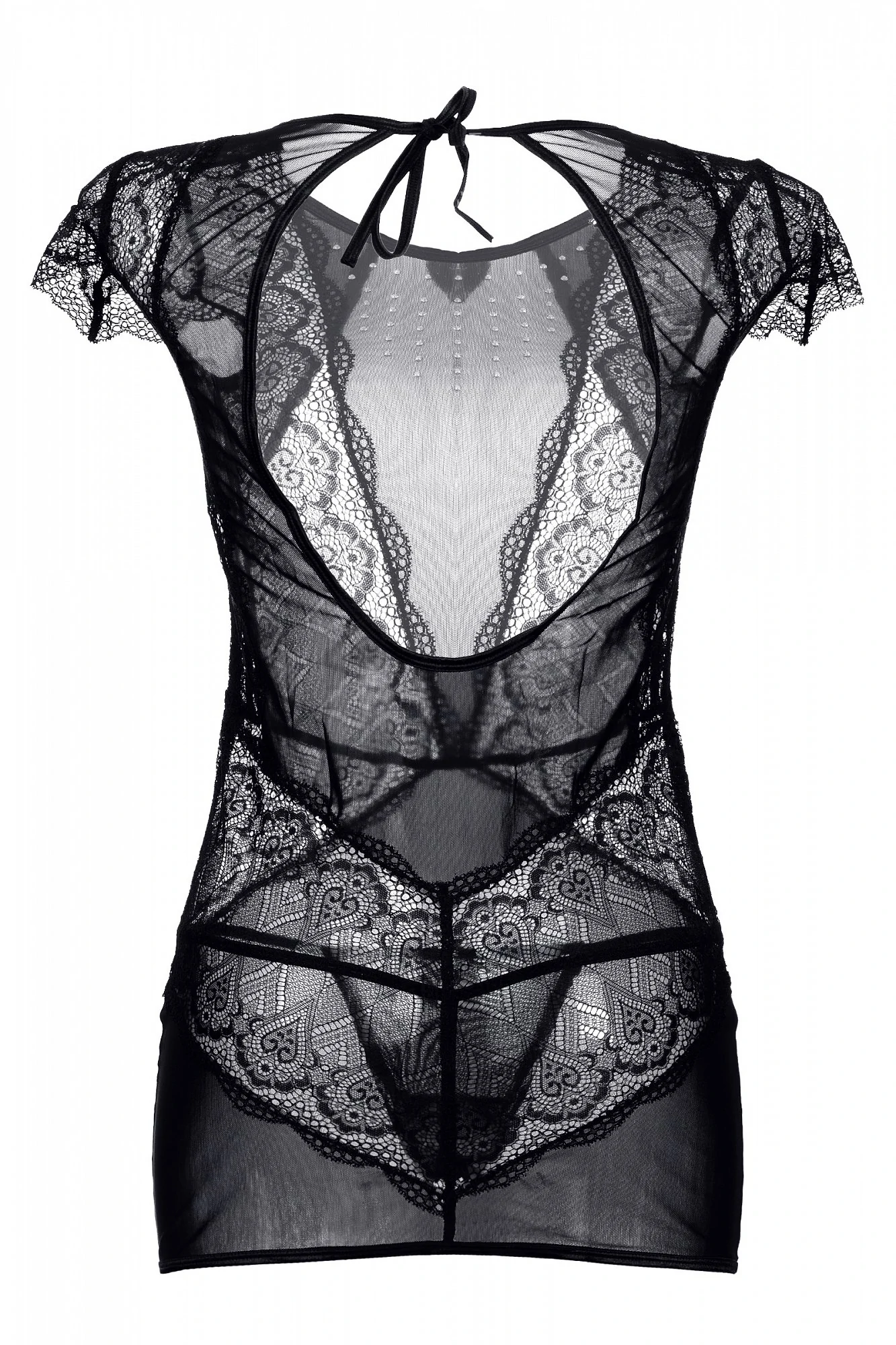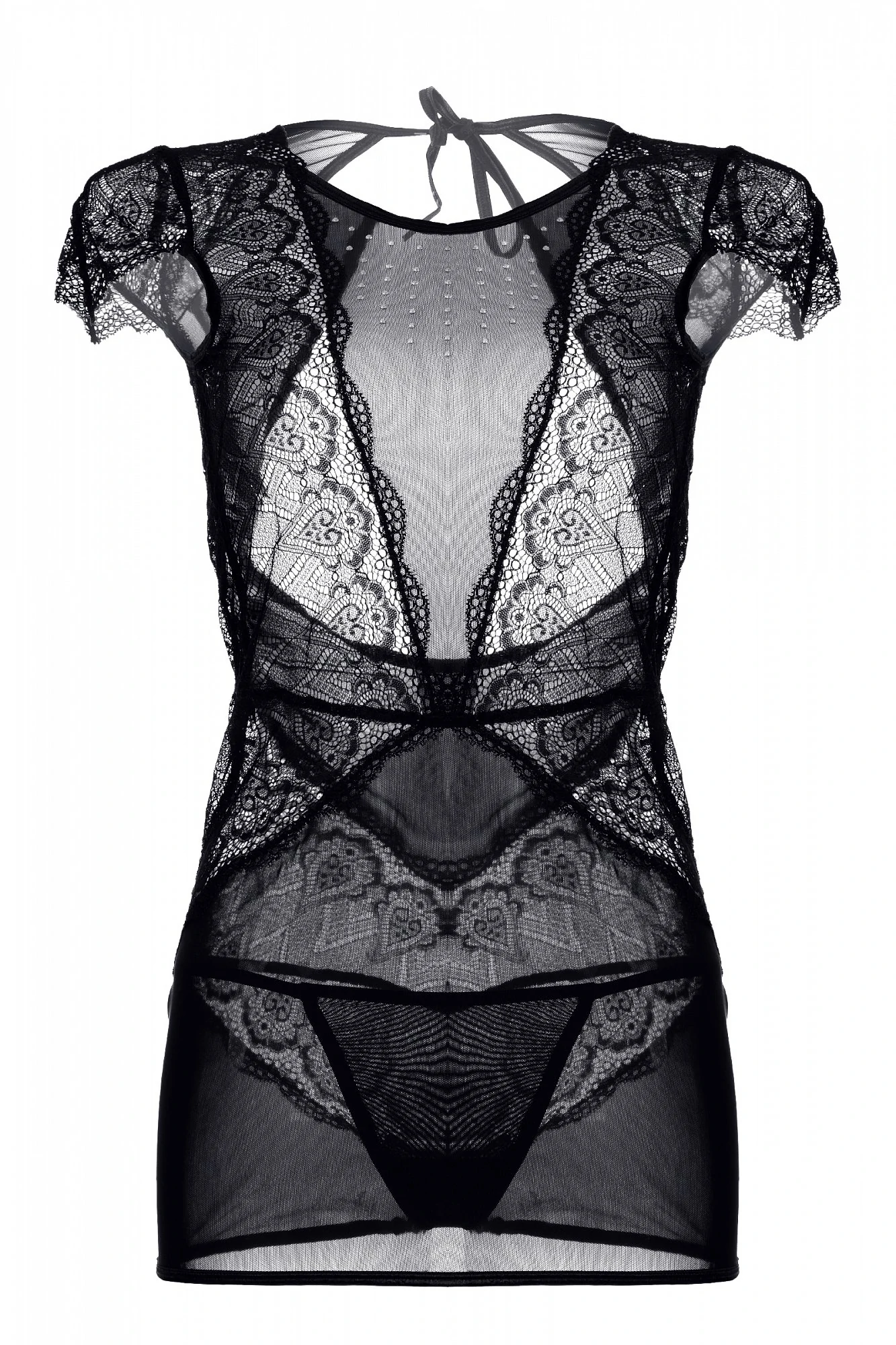 Платье Candy Girl Estelle из эластичной сетки с шикарным рельефным кружевом, открытой спиной и миниатюрными рукавами украшено россыпью серебристых страз в зоне декольте. Продуманный дизайн визуально формирует приталенный силуэт. Завязки на шее сзади позволяют снять наряд в считанные мгновения. Т-стринги в комплекте.