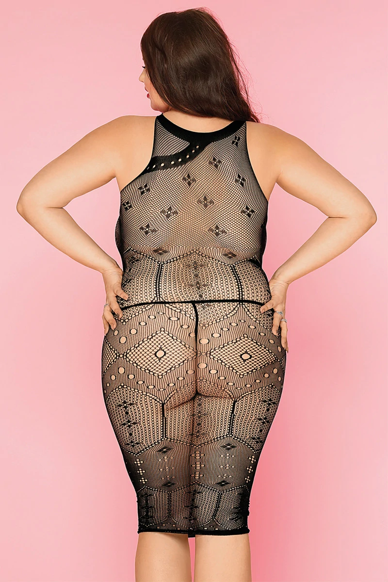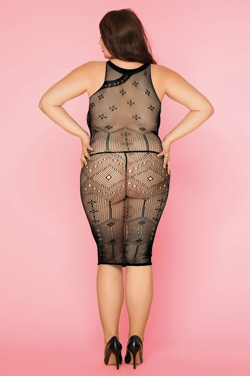 Эластичное бесшовное платье из сетки Spice от Candy Girl с абстрактным рисунком плетения приковывает внимание к декольте. Длина до середины колена подчеркивает соблазнительный изгиб лодыжек. Стринги в комплекте. Размер: 2XL.