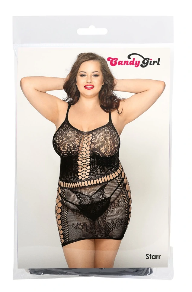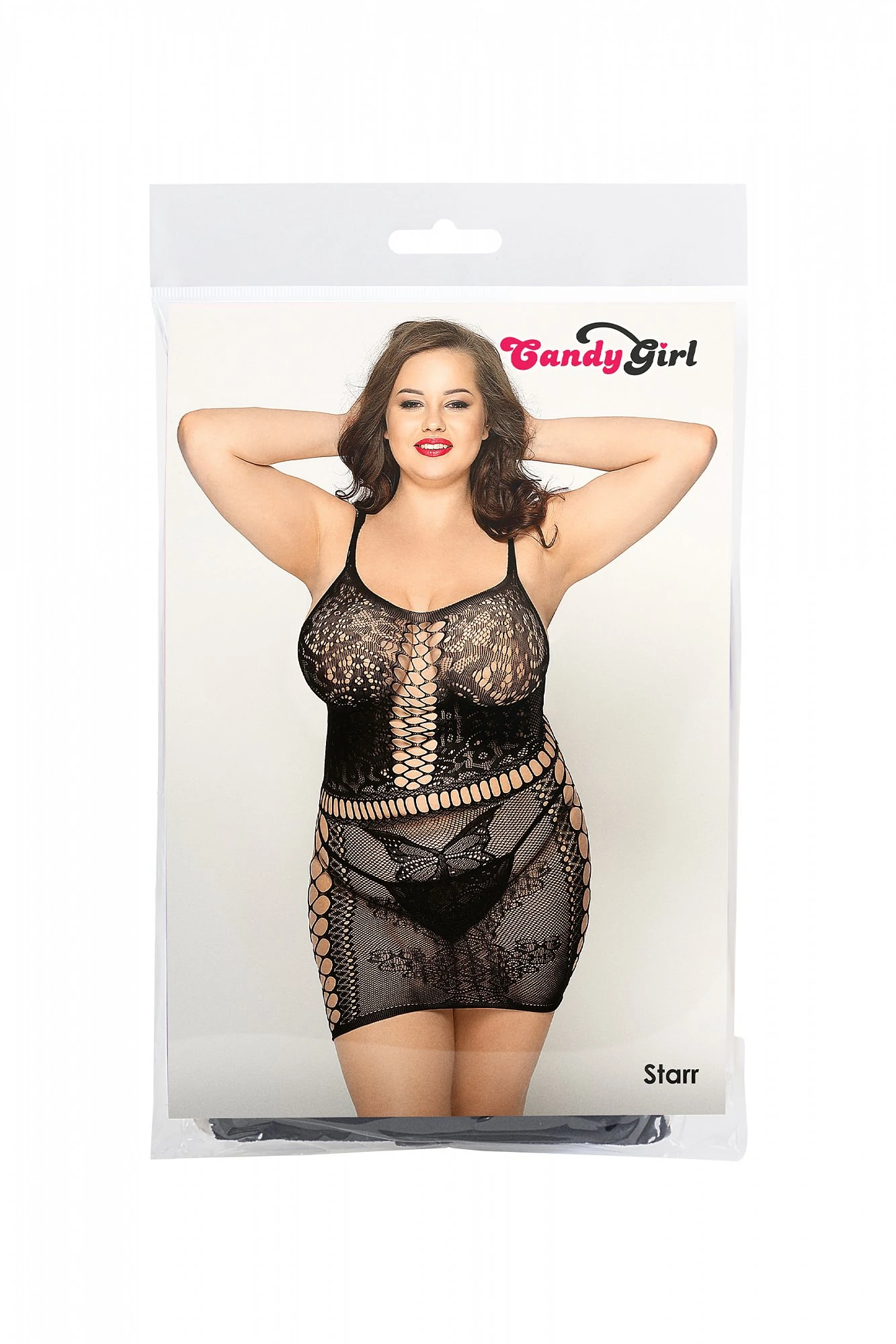 Эластичное бесшовное мини-платье из сетки Candy Girl Starr украшено сочетанием различных плетений. Оно подчеркивает талию, зону декольте и бедра. Стринги в комплекте. Размер: 2XL.
