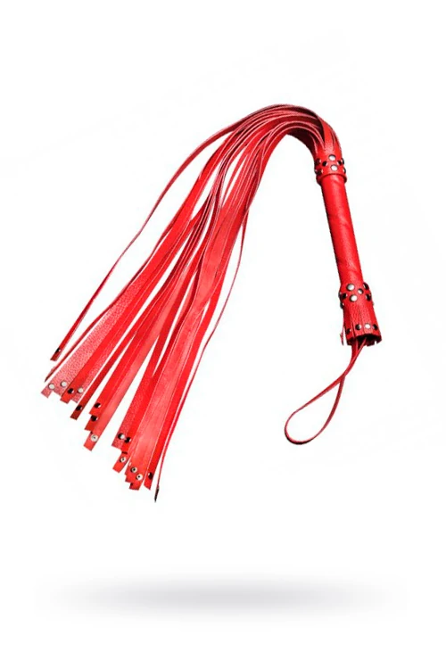 Плеть усиленная, имеет 30-35 хвостов длиной 40-45 см. Хвосты имеют вид лент шириной 7 мм. Ручка металлическая, обтянутая кожей. Цвет красный.