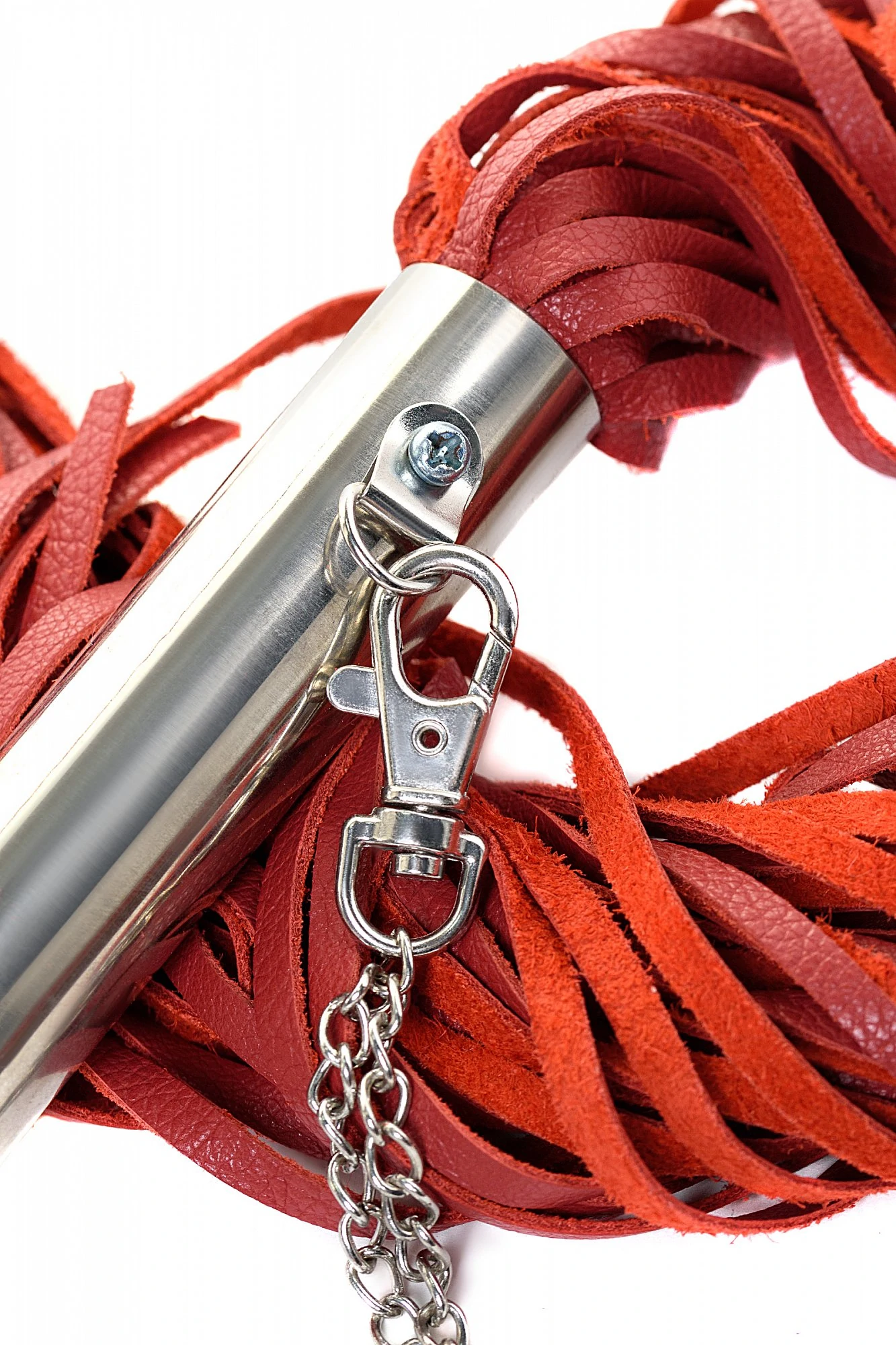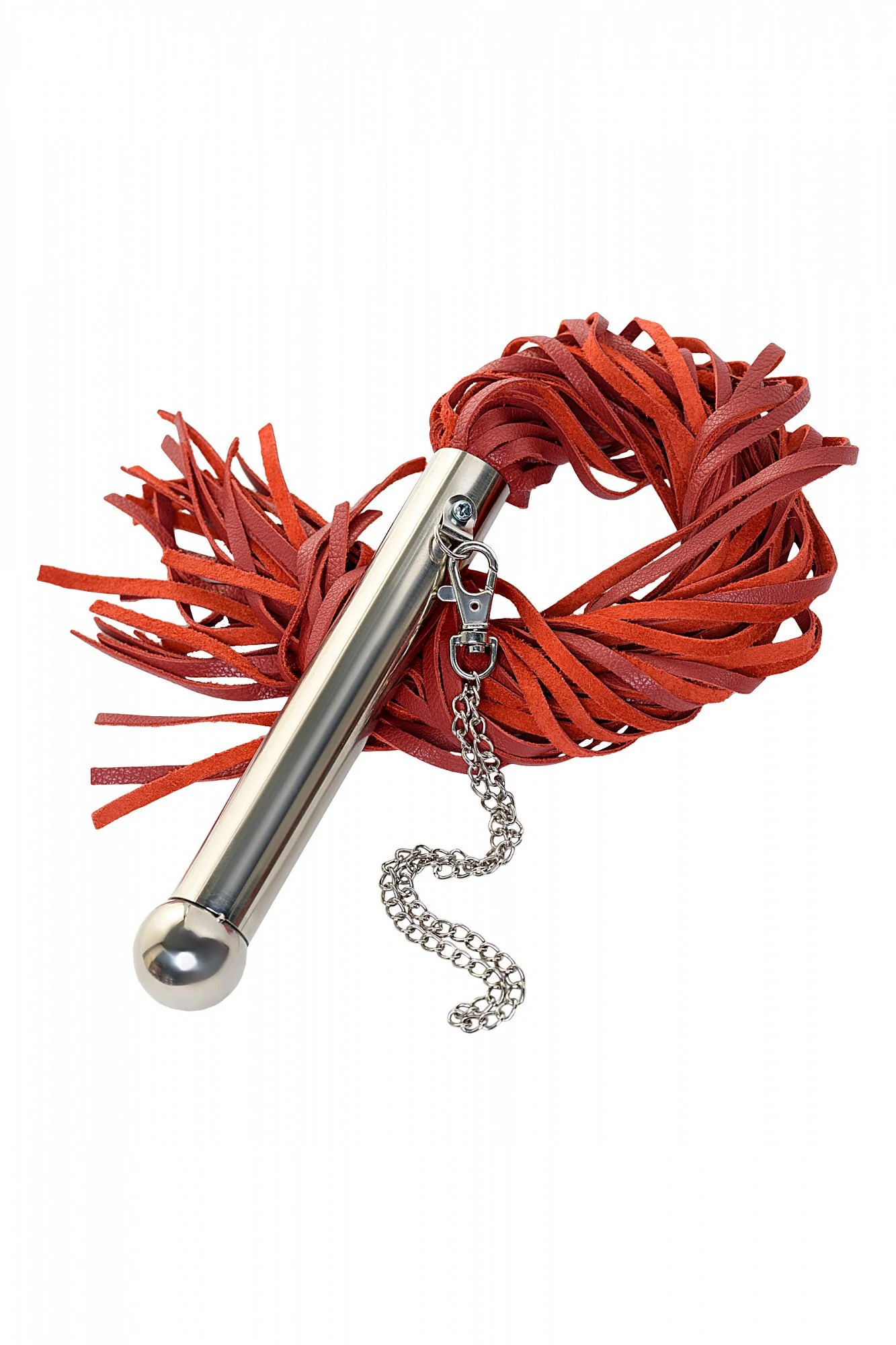 Стильная плеть из красной кожи с металлической рукояткой. Рукоятка 18 см с петлей - цепочкой. Предназначена для средних и сильных воздействий по разогретому телу партнера.Рекомендуем перед игрой предварительно смазать кожу массажными маслами для защиты от сильных повреждений и быстрого восстановления.