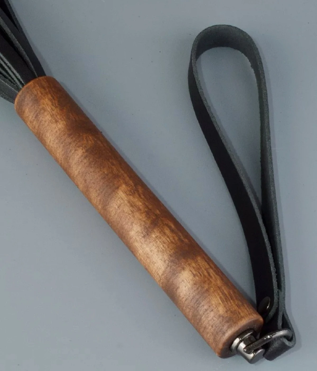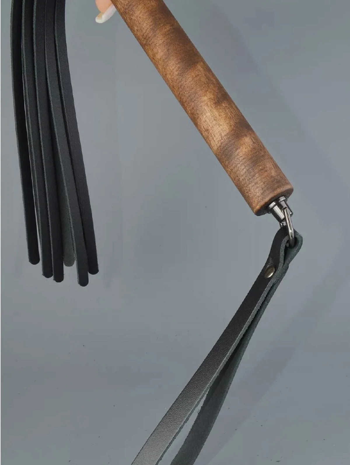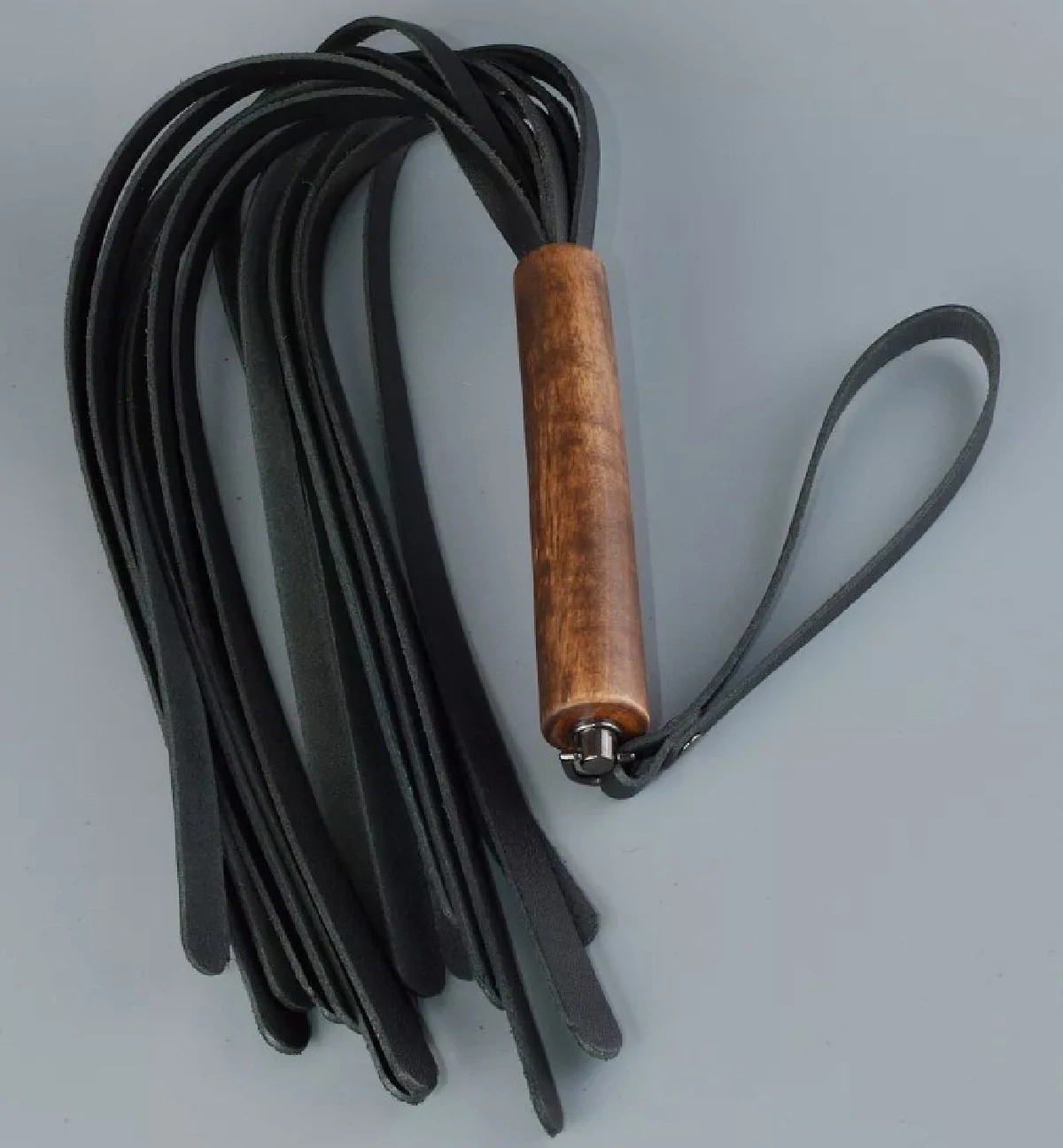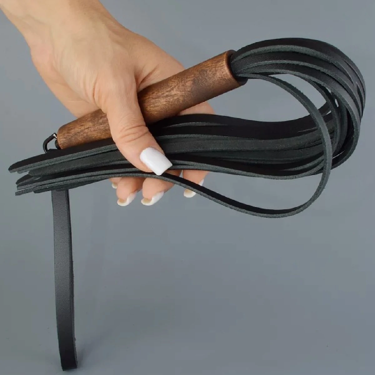 Классическая чёрная плеть – это один из основных атрибутов ролевых игр, при помощи которого, можно и поощрить, поглаживая, и наказать, более сильными ударами, и просто разогреть тело, для обострения тактильной и эмоциональной чувственности. Плеть серии Эко состоит из деревянной рукояти и ударной части, плоские ленты из натуральной кожи черного цвета. Размер: общая длина изделия около 58 см, длина рукояти 14 см, длина плетей 44 см, ширина лент 1 см.
