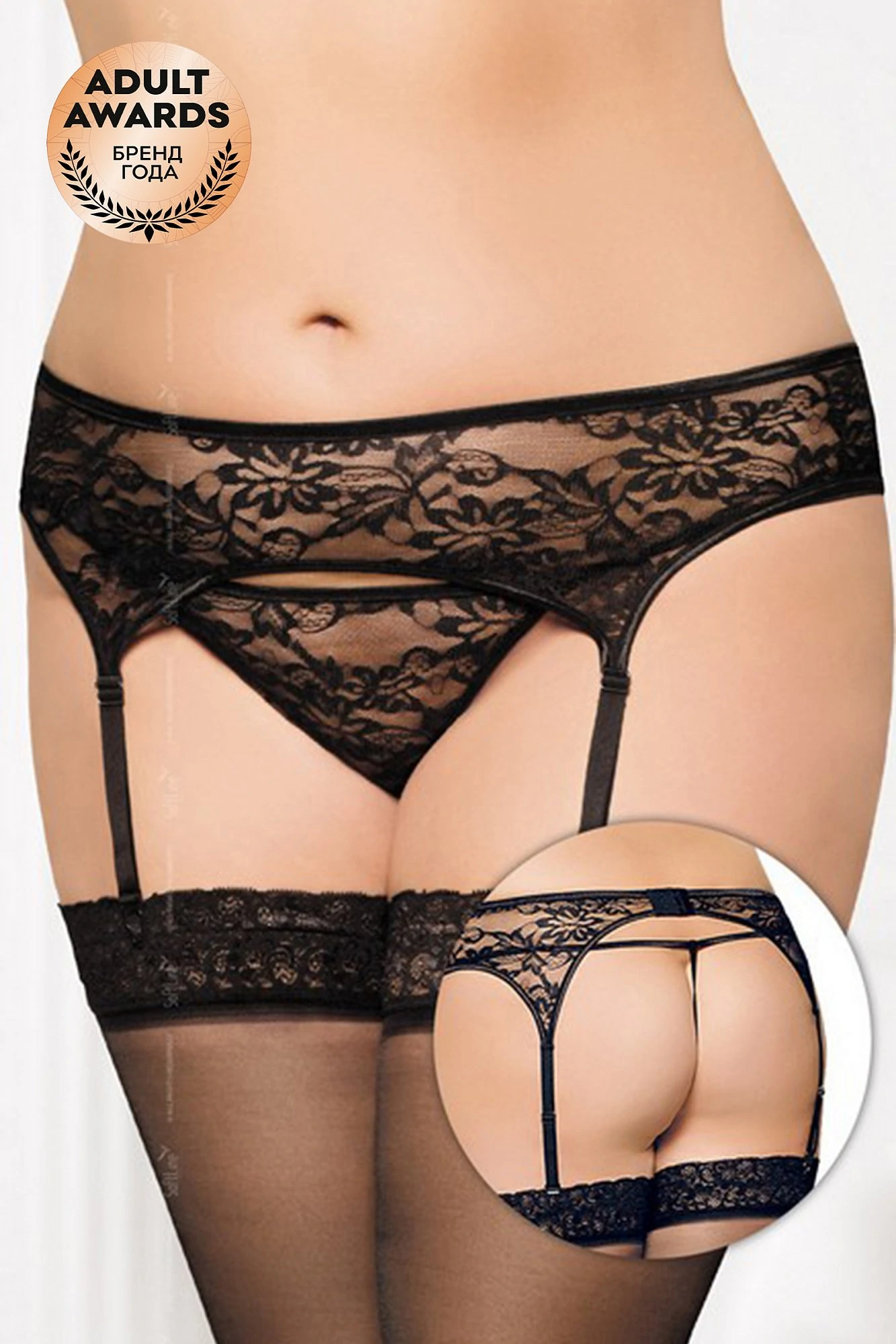 Комплект: пояс для чулок и стринги закрытые. Пояс и стринги выполнен из кружевного материала с цветочным орнаментом.