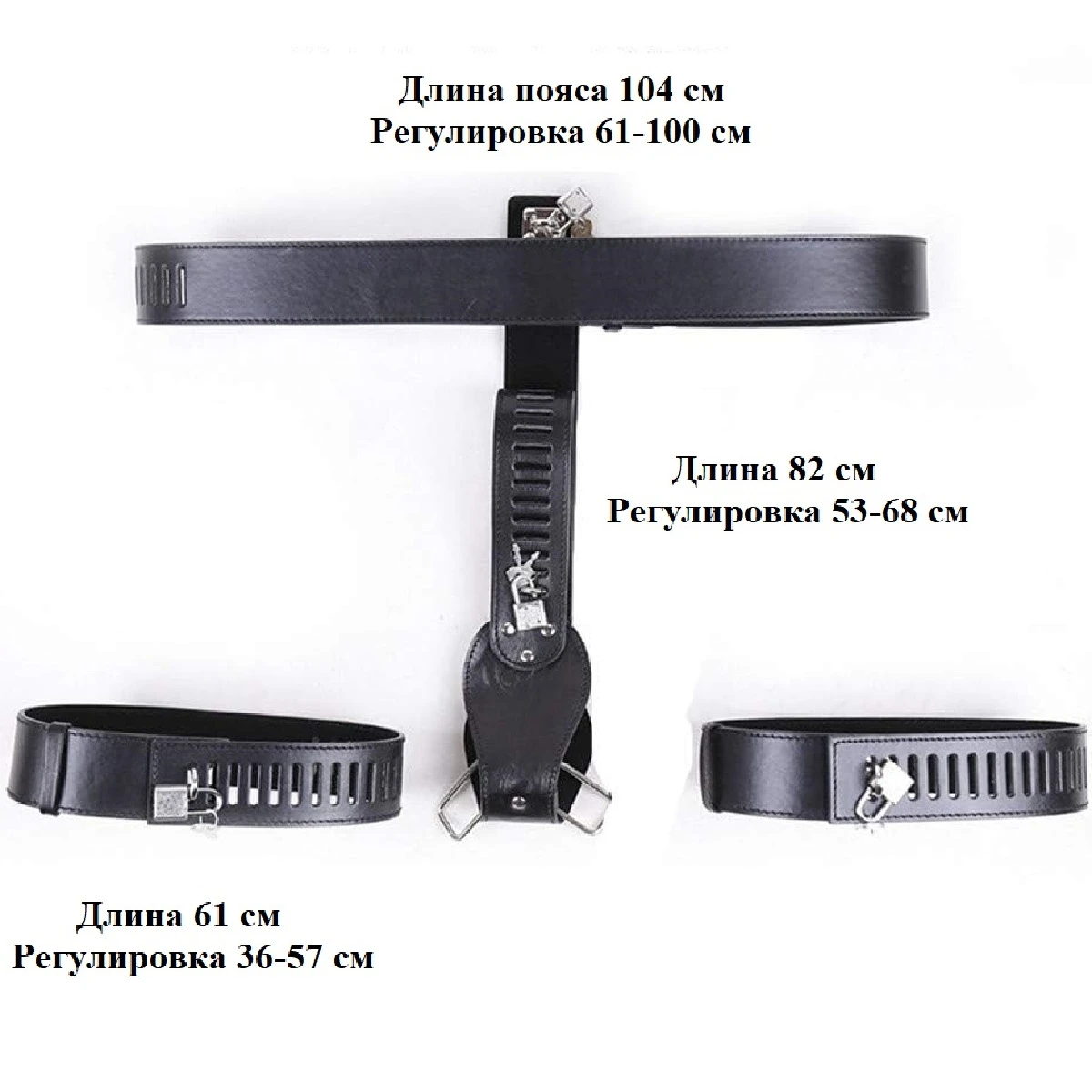 Пояс верности женский-это откровенный аксессуар для очень горячих БДСМ игр. Закройте интимные места любимой, сейчас только Вы решаете, когда ей будет разрешено снять пояс! Кожаные трусики черного цвета регулируются по размеру, поэтому хорошо сядут практически на любую фигуру. Выглядят не громоздко, поэтому в них можно отправиться на прогулку. В комплекте 4 ремня и 5 замочков, в комплекте к каждому по 2 ключика. Размер: длина пояса 104 см, длина ремня для промежности 82 см, длина ремней для бедер по 61 см. Цвет черный.