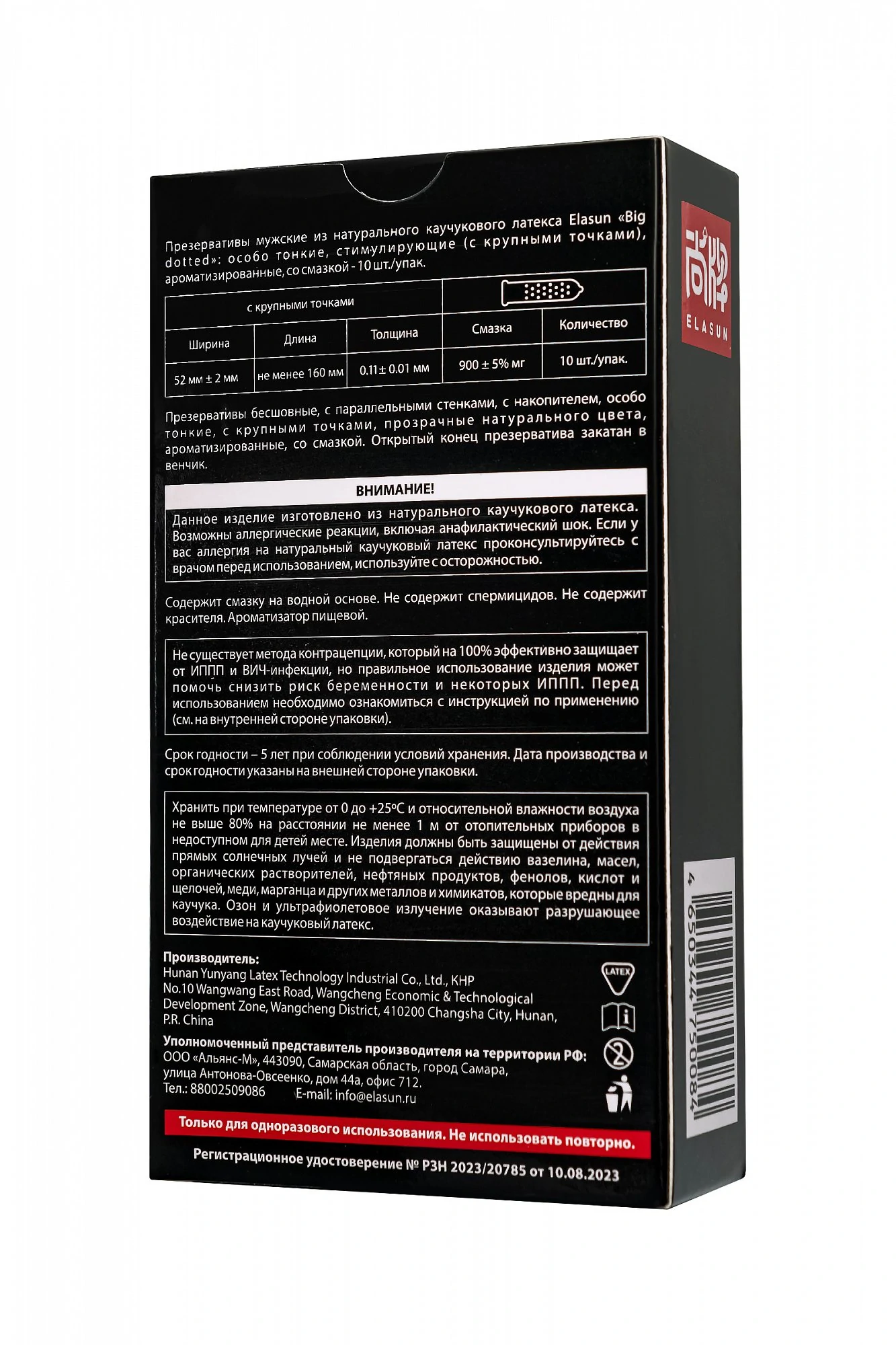 Elasun Big dotted - это больше, чем просто защита, это ключ к ярким, незабываемым ощущениям. Экстратонкие презервативы из натурального каучукового латекса созданы для тех, кто хочет испытать максимальную близость, сохранив абсолютную надежность. Особая текстура с крупными точками нежно стимулирует самые чувствительные зоны, включая легендарную точку G, даря вам и вашему партнеру взрывные волны наслаждения. Уникальная смазка на основе гиалуроновой кислоты обеспечивает шелковистую гладкость и комфорт, создавая эффект естественности и чувственности в каждом движении. А нежный фруктовый аромат превращает каждый момент в особенный ритуал, добавляя нотку страсти и романтики. Упаковка из 10 презервативов - идеальный выбор для тех, кто хочет исследовать новые горизонты удовольствия.