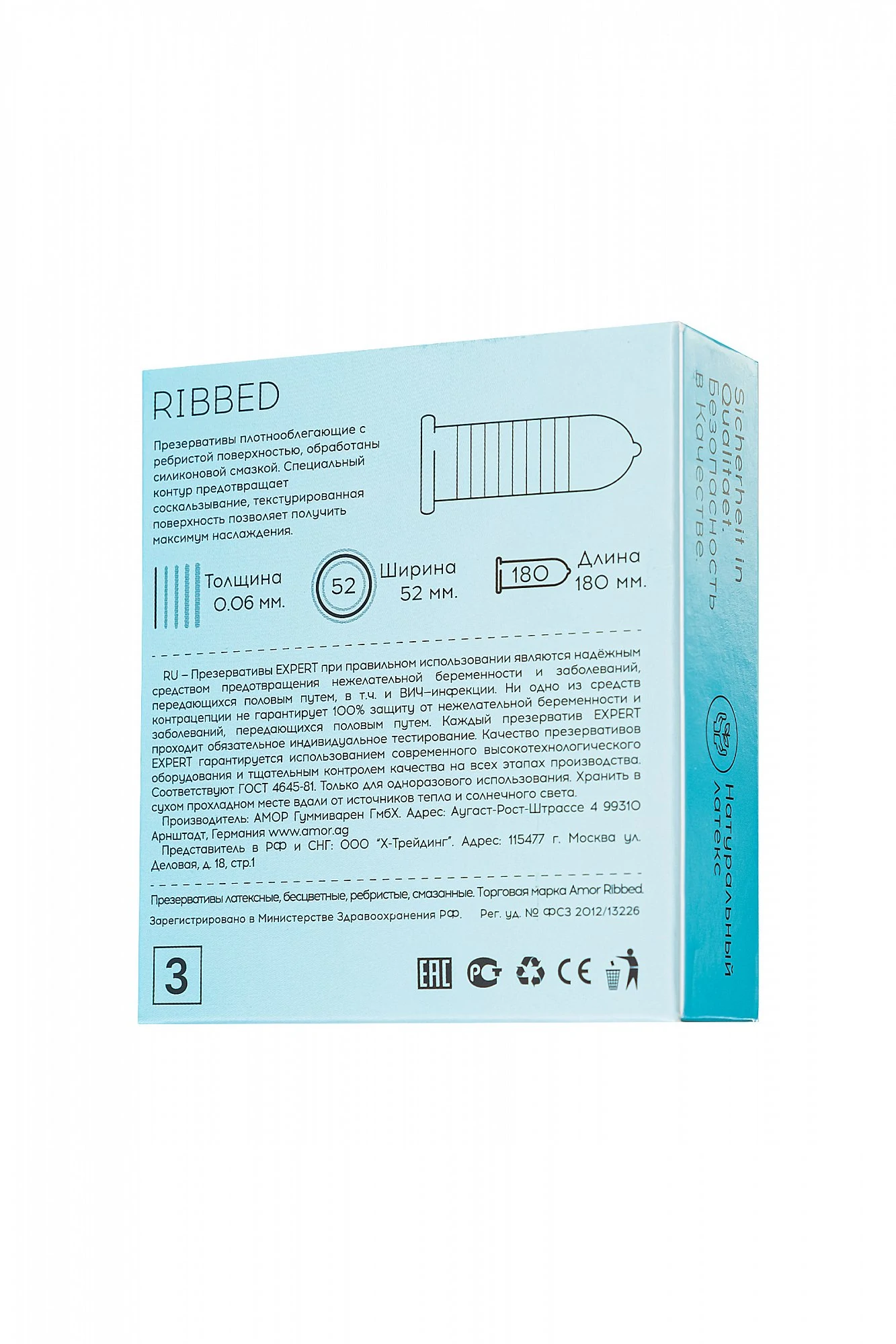 Презервативы Expert Ribbed с накопителем, с ребристой структурой. Рельефная структура поверхности презерватива обеспечивает дополнительную стимуляцию, доставляя исключительное удовольствие обоим партнерам. Размер: длина 18 см, ширина 5,2 см, толщина стенки презерватива: 0,08 мм. В упаковке 3 шт.