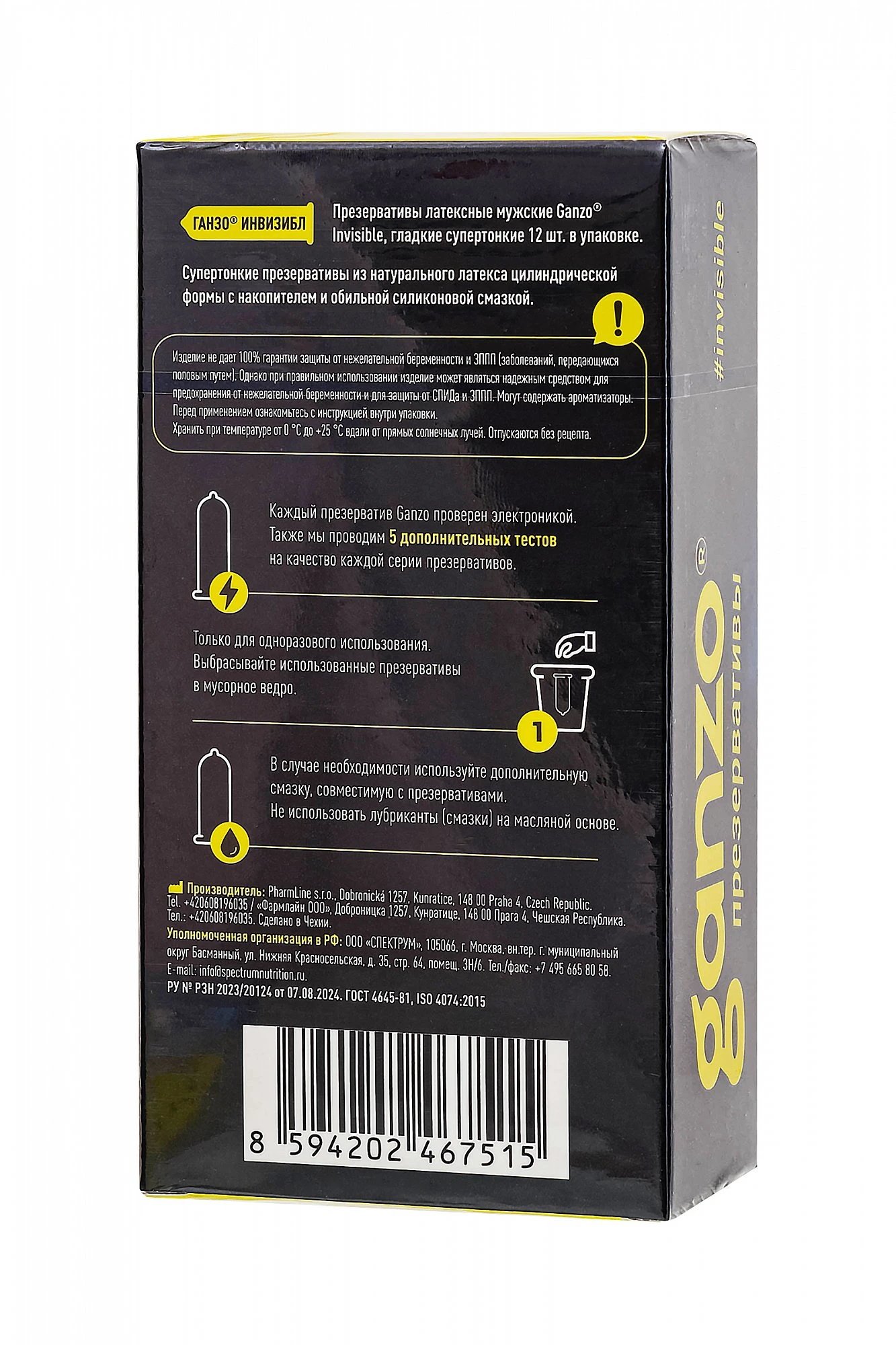 Любителям естественных ощущений надо запомнить лишь одно название презервативов - Ganzo Invisible. Супертонкие презервативы в обильной смазке на силиконовой основе сохраняют максимальный комфорт во время секса. При этом уровень защиты остаётся на потрясающе высоком уровне! Характеристики: материал презерватива - латекс. Количество презервативов: 12. Длина презерватива: 18 см. Ширина презерватива: 5,2 см. Толщина стенки презерватива: 0,045 мм.