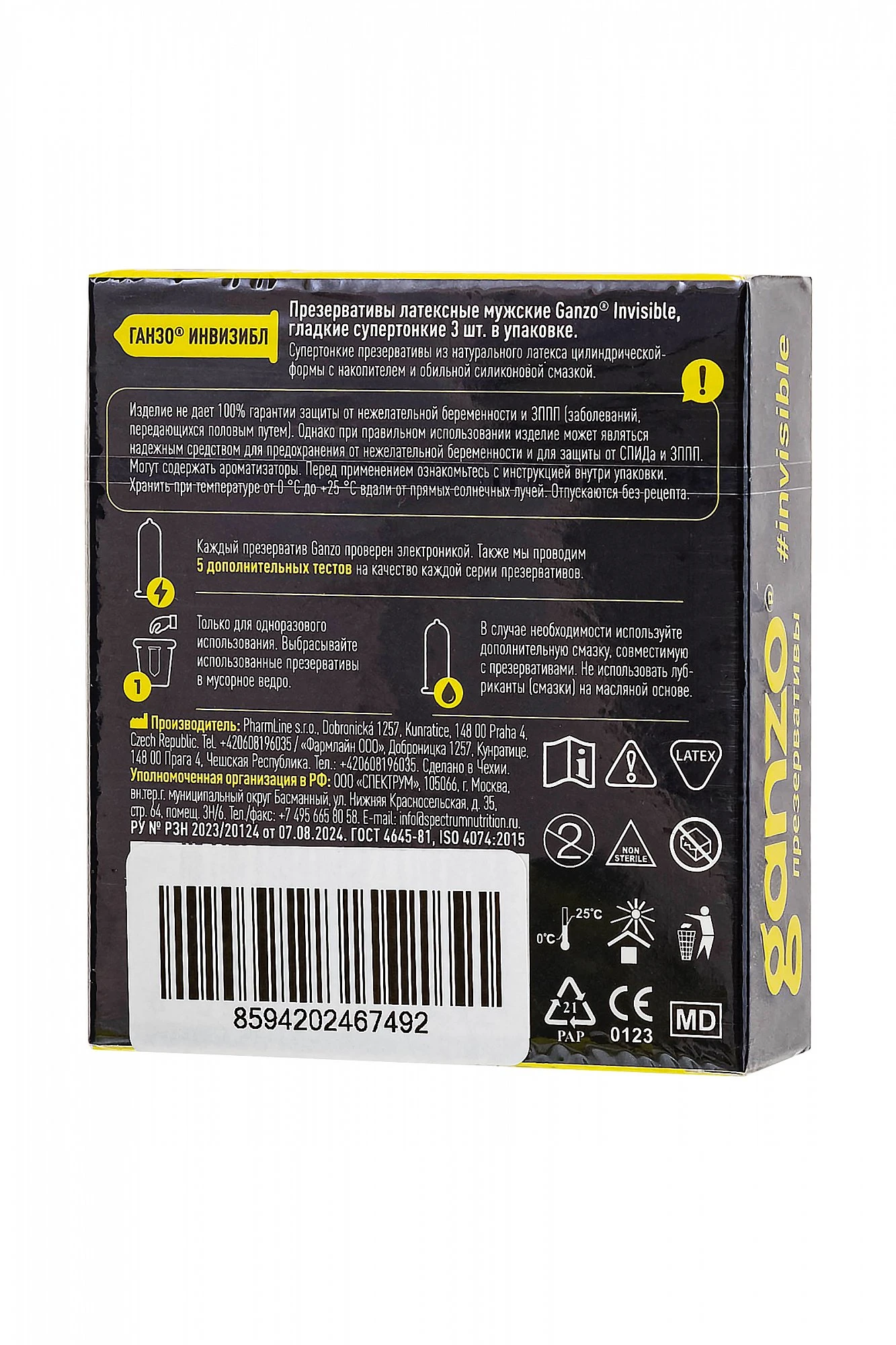 Любителям естественных ощущений надо запомнить лишь одно название презервативов - Ganzo Invisible. Супертонкие презервативы в обильной смазке на силиконовой основе сохраняют максимальный комфорт во время секса. При этом уровень защиты остаётся на потрясающе высоком уровне! Характеристики: материал презерватива - латекс. Количество презервативов: 3. Длина презерватива: 18 см. Ширина презерватива: 5,2 см. Толщина стенки презерватива: 0,045 мм.