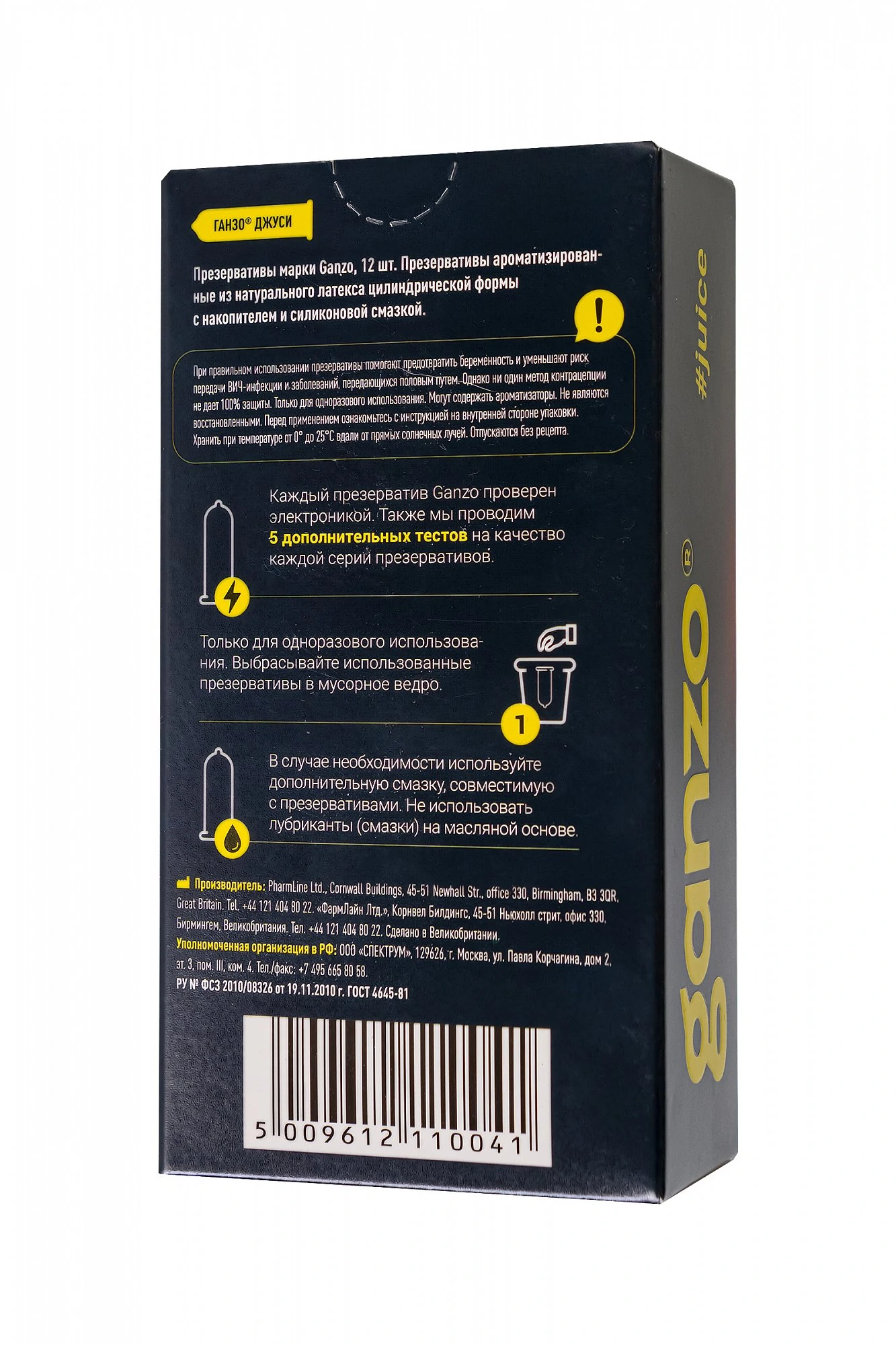 Презервативы Ganzo Juice -это премиальное качество натурального латекса, обильная смазка, комфортное прилегание, различные цвета и ароматы – сделают твой интимный контакт ароматно-цветным путешествием! Желтый – и ты в ванильном облаке, черный – ежевичное настроение, красный – полный тутти-фрутти. Зажгите пламя страсти с презервативы Ganzo Juice! Фруктовые презервативы Ganzo Juice - это яркость, активность и вкусное разнообразие. Хотите разнообразить ваши отношения? Презервативы Ганзо Джус внесут фруктовую нотку. Размер: длина 18 см, диаметр 5,2 см, толщина стенки презерватива 0,06 мм. В упаковке 12 шт.