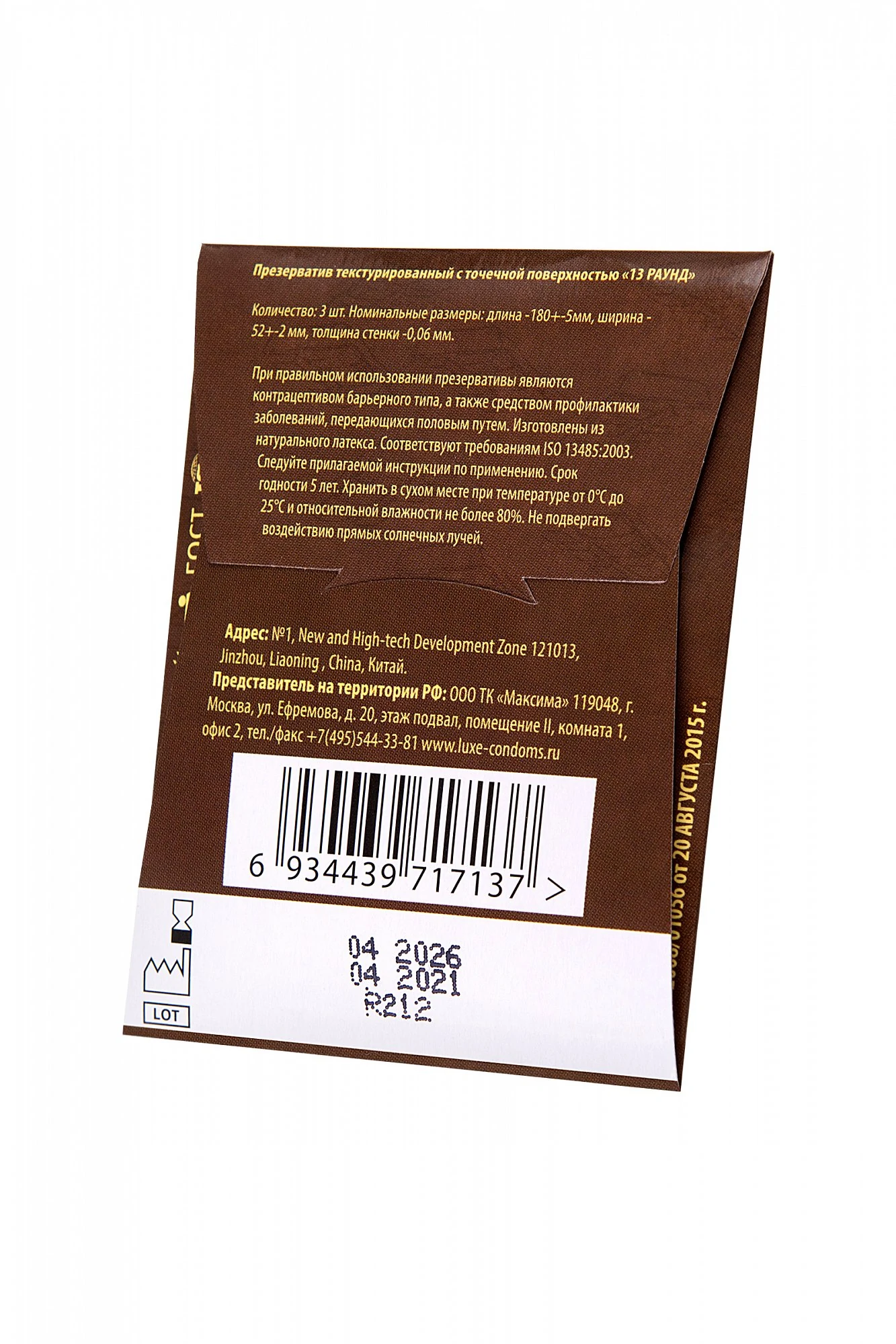 Презервативы текстурированные. В упаковке 3 шт. Аромат: шоколад. Размер: 18 см, ширина 5,2 см, толщина стенки 0,06 мм.