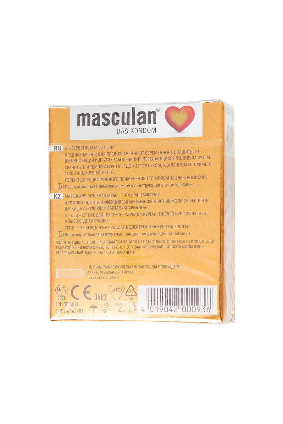Презервативы Masculan Ultra из утонченного латекса, с нежным ароматом ванили. Презерватив классический, золотого цвета со смазкой и накопителем. Тонкие настолько, что их просто не ощущаешь. Подходят для любого вида секса. Эти золотые презервативы без лишних затрат окунут с головой в мир роскоши и наслаждений. Вперед и пусть уже сегодня вечером вашу спальню украшает самый лакомый и дорогой слиток. Длина 190 мм, ширина 53 мм, толщина 0,034 мм. Материал - натуральный латекс. В упаковке -3 шт.