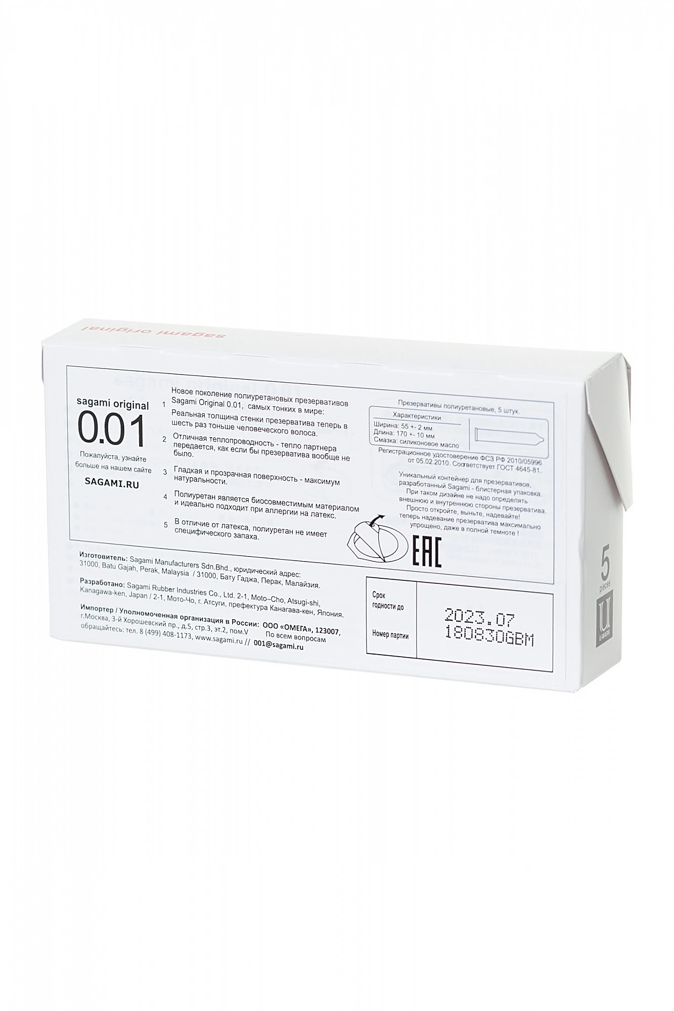 Sagami Original 0.01 - это новое поколение полиуретановых презервативов Sagami Оriginal. Реальная толщина стенки презерватива теперь в шесть раз тоньше человеческого волоса. супер-тонкие, супер-прочные, обладающие идеальной теплопроводимостью. Идеал среди презервативов! С ними вы забудете обо всем, отдаваясь приятному процессу целиком и без каких-либо барьеров! Sagami 0.01 в 4 раза тоньше обычных тонких латексных презервативов и в почти 2 раза тоньше своих предшественников Sagami 0.02. Полиуретан является биосовместимым материалом и идеально подходит людям, страдающим аллергией на латекс. Номинальная ширина - 55 +/- 2 мм. Номинальная длина - 170 +/- 2 мм. Номинальная толщина стенки - 0,01 мм (18 микрон), что составляет 1/6 толщины человеческого волоса! В упаковке 5 шт.