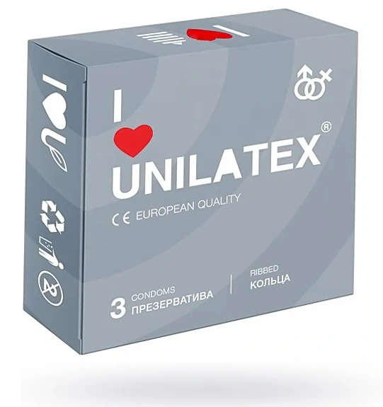 Unilatex Ribbed - поверхность с кольцами. Презервативы из натурального латекса телесного цвета, рифленойповерхностью, покрыты силиконовой смазкой с нейтральным ароматом.Размер: длина 19 см, диаметр 5, 4 см, толщина стенки 0,06 мм. В упаковке 3 шт.