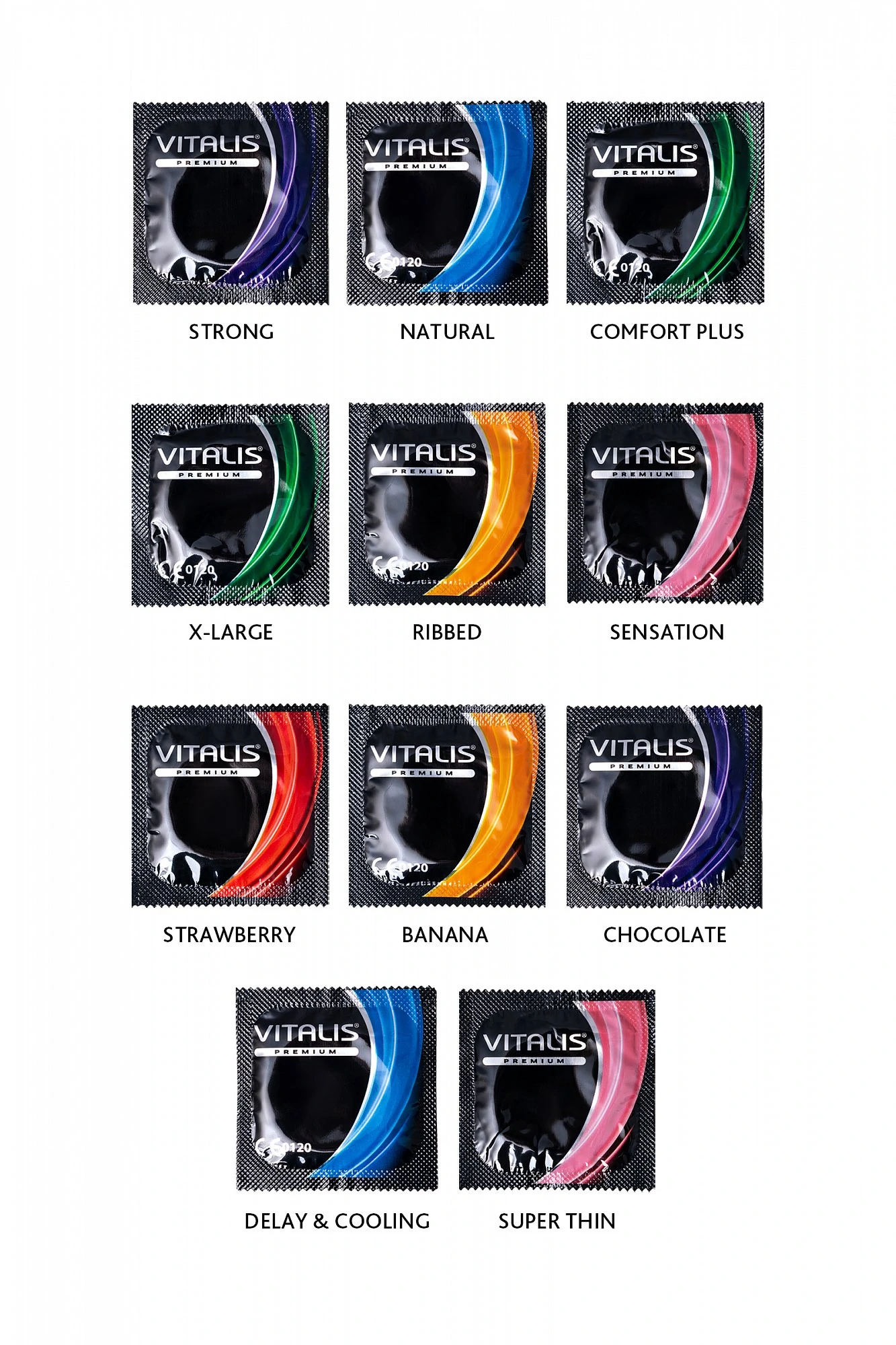 Попробуйте все виды элитных немецких презервативов VITALIS premium и получите незабываемое удовольствие. В упаковке 10 видов презервативов: цветные и ароматизированные - помогут внести разнообразие в любовную жизнь. 3 аромата: черный - шоколад, красный - клубника, желтый - банан. Анатомической формы - контурный презерватив расширен в области головки, что дает повышенный комфорт посадки. Охлаждающий - продлевает эрекцию, даря восхитительное наслаждение. Классический - прозрачный презерватив классической формы со смазкой без запаха. Ребристый - ребристая поверхность стимулирует эрогенные зоны женщины. С кольцами и точками - для максимальной стимуляции обоих партнеров. Согревающий - согревающая смазка усиливает чувствительность. С утолщенной стенкой - утолщенная стенка 0,09 мм создана для любителей экспериментов в постели. Супертонкий - утонченная стенка сделает секс максимально чувственным и естественным. Увеличенный - презерватив шириной 57 мм и длиной более 190 мм. В упаковке 15 шт.