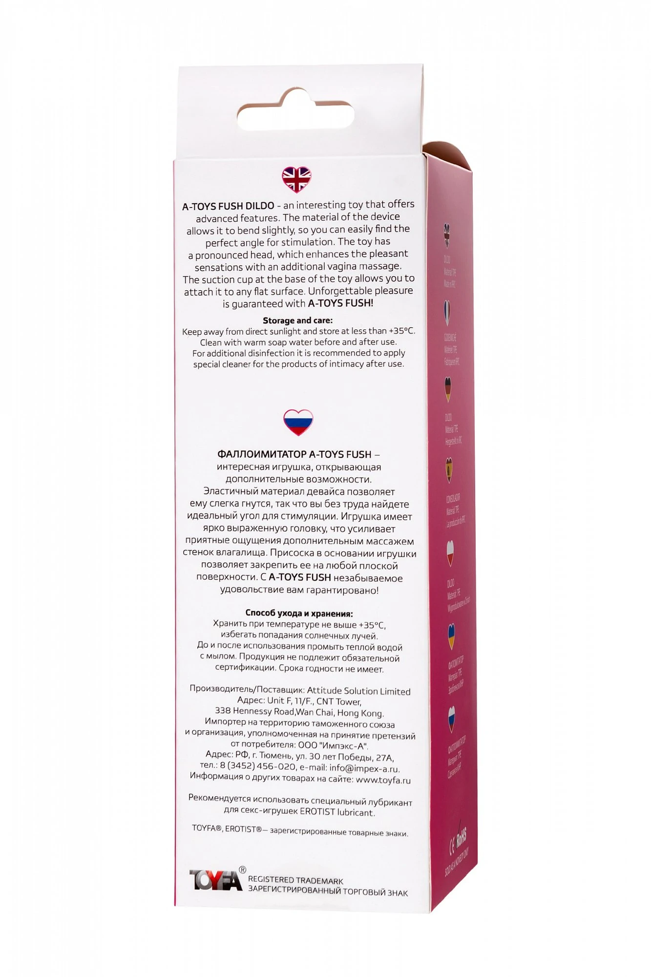 Фаллоимитатор A-Toys Fush – интересная игрушка, открывающая дополнительные возможности. Эластичный материал девайса позволяет ему слегка гнутся, так что вы без труда найдете идеальный угол для стимуляции. Игрушка имеет ярко выраженную головку, что усиливает приятные ощущения дополнительным массажем стенок влагалища. Присоска в основании игрушки позволяет закрепить ее на любой плоской поверхности. Размер: общая длина 18 см, рабочая длина 13 см, диаметр 3,5 см. Цвет: розовый. Для более комфортного использования рекомендуем приобрести смазку на водной основе и очищающий спрей Clear Toy 100 мл для обработки изделия.