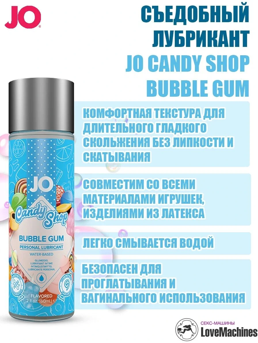 JO H2O Candy Shop Flavored JO - PH-сбалансированный интимный лубрикант на водной основе с потрясающим насыщенным вкусом жвачки Бабл Гам. Созданный с использованием глицерина исключительно растительного происхождения. Все ингредиенты высшего качества и только натуральные вкусовые ароматизаторы. Формула лубриканта не содержит сахара, искусственных подсластителей, парабенов и пропилен гликоля. Обеспечивает комфортное нежное скольжение без липкости. Абсолютно безопасен для орального применения, не имеет послевкусия. Применение: