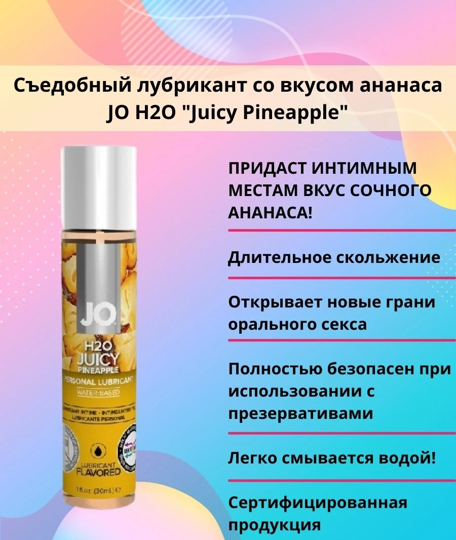 Ароматизированный лубрикант Ананас на водной основе JO Flavored Juicy Pineapple - длительное гладкое скольжение без липкости и без скатываний. Естественный вкус благодаря только натуральным ароматизаторам. Без сахара, без подсластителей, не нарушает микрофлору и кислотно-щелочной баланс. Без искусственных добавок. Совместим с алкоголем. Можно добавлять в напитки, использовать как топинг, смешивать коктейль из разных вкусов. Идеален для оральных игр. На водной основе, но нежный как силикон, долгое скольжение, никакой липкости, легко смывается водой. JO рекомендуется во всем мире врачами и фармацевтами. Обладает всеми преимуществами фаворита JO H2O, плюс приятный аромат и нежная сладость. Применение: небольшое количество персонального любриканта, нанесите на интимные участки. Для использования с презервативом, нанесите на наружную сторону презерватива. Безопасен для латексных изделий. Хранение: держать в закрытом виде. Хранить в сухом месте при температуре не ниже 5С и не выше 25С. Объем: 30мл.