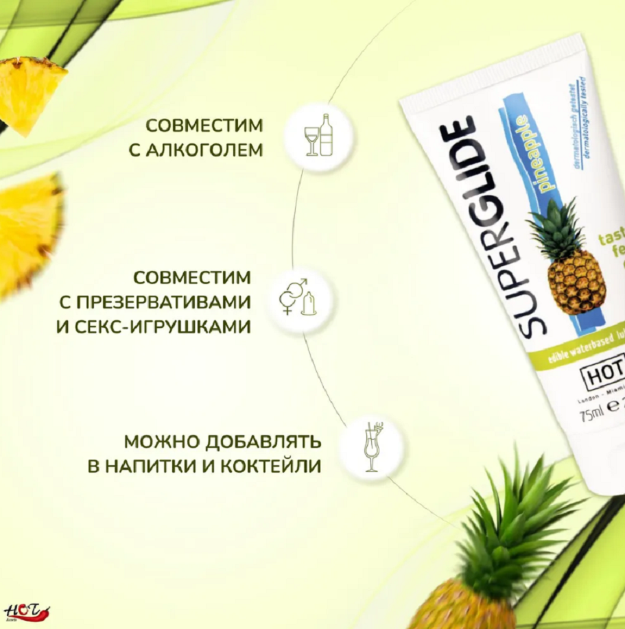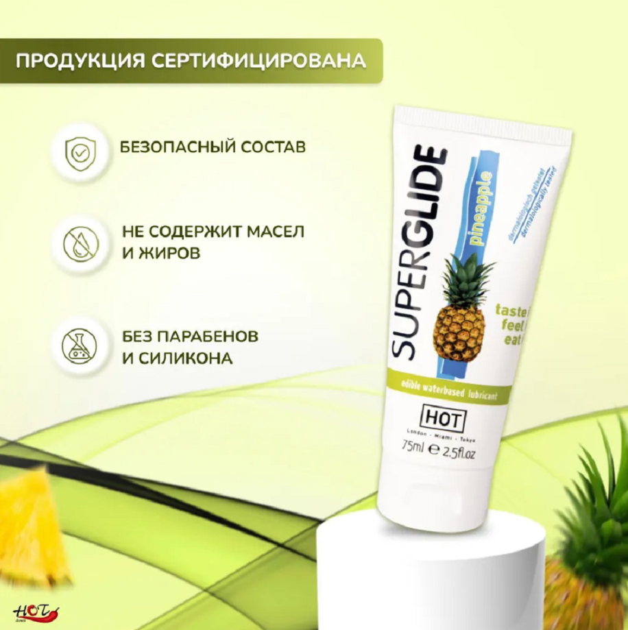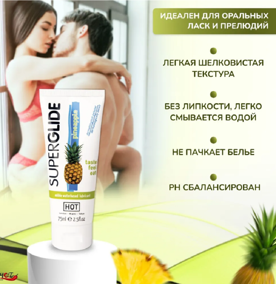 Съедобный лубрикант с ароматом и вкусом ананаса, на водной основе. Идеально подходит для использования с латексными изделиями. Ощутите и попробуйте его! Объем: 75 мл. Прошел дерматологические тестирования.