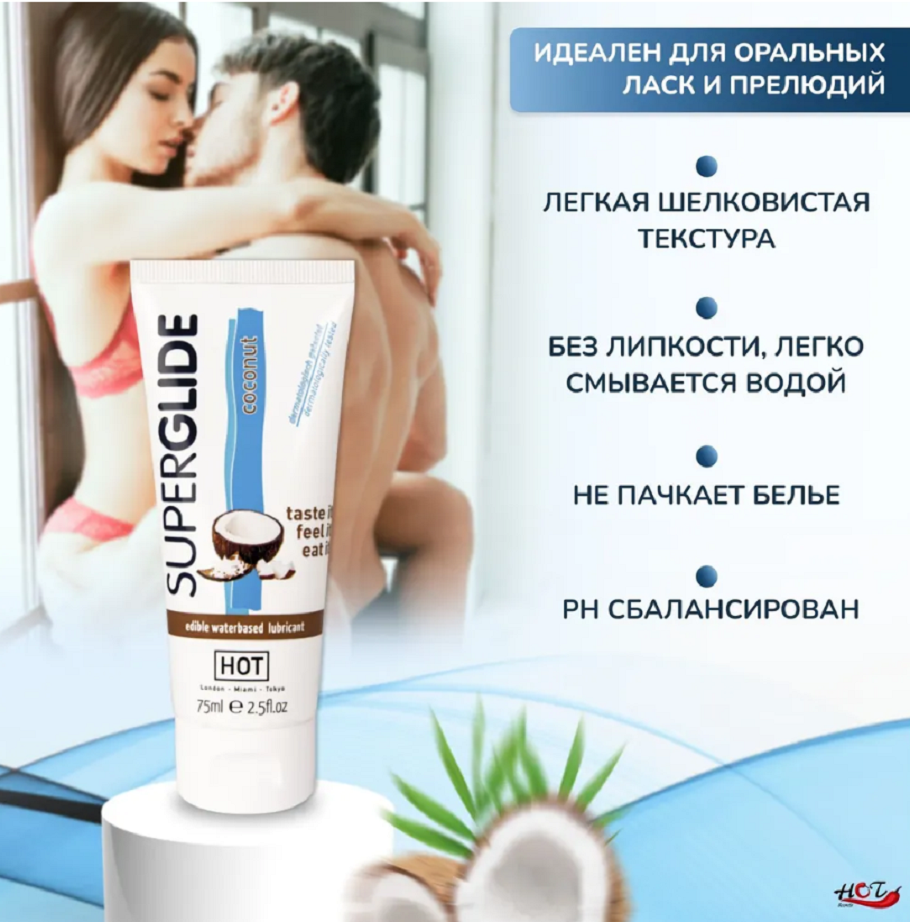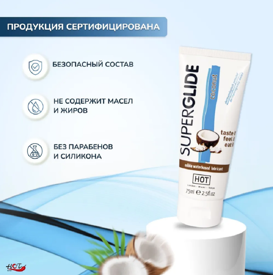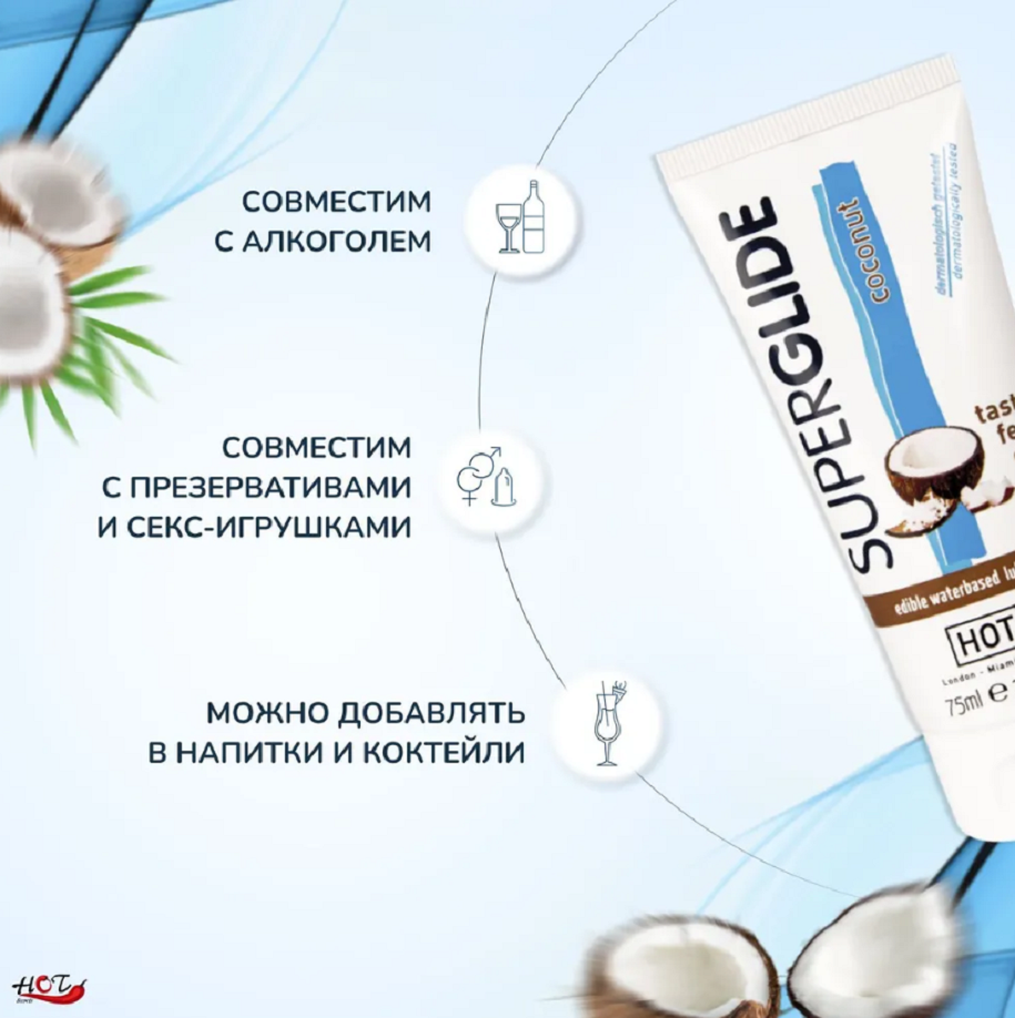 Универсальный лубрикант Hot Super Glide Coconut с восхитительным ароматом и вкусом экзотического кокоса подходит для всех видов эротических игр. Она сделает кожу нежной и бархатистой, обеспечит ультра длительное скольжение и надолго избавит от сухости и дискомфорта. Внесите разнообразие в свою интимную жизнь со съедобной смазкой! Объем: 75 мл.