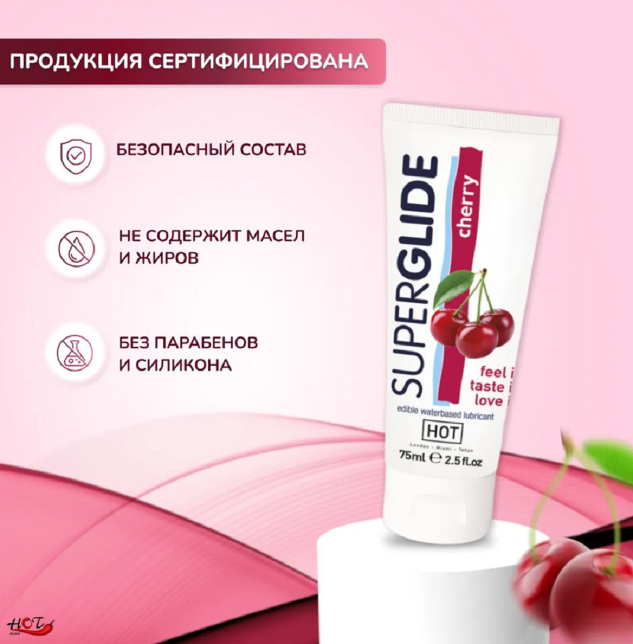 Съедобный лубрикант с ароматом и вкусом вишни, на водной основе. Идеально подходит для использования с латексными изделиями. Ощутите и попробуйте его! Прошел дерматологические тестирования. Объем: 75 мл.