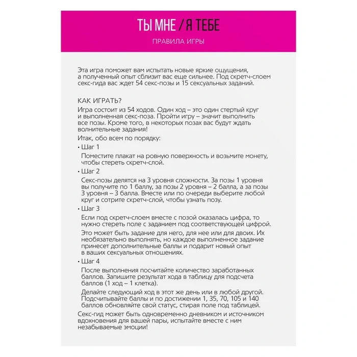 Ваш личный секс-гид. Эта игра поможет вам испытать новые яркие ощущения, а полученный опыт сблизит вас ещё сильнее.