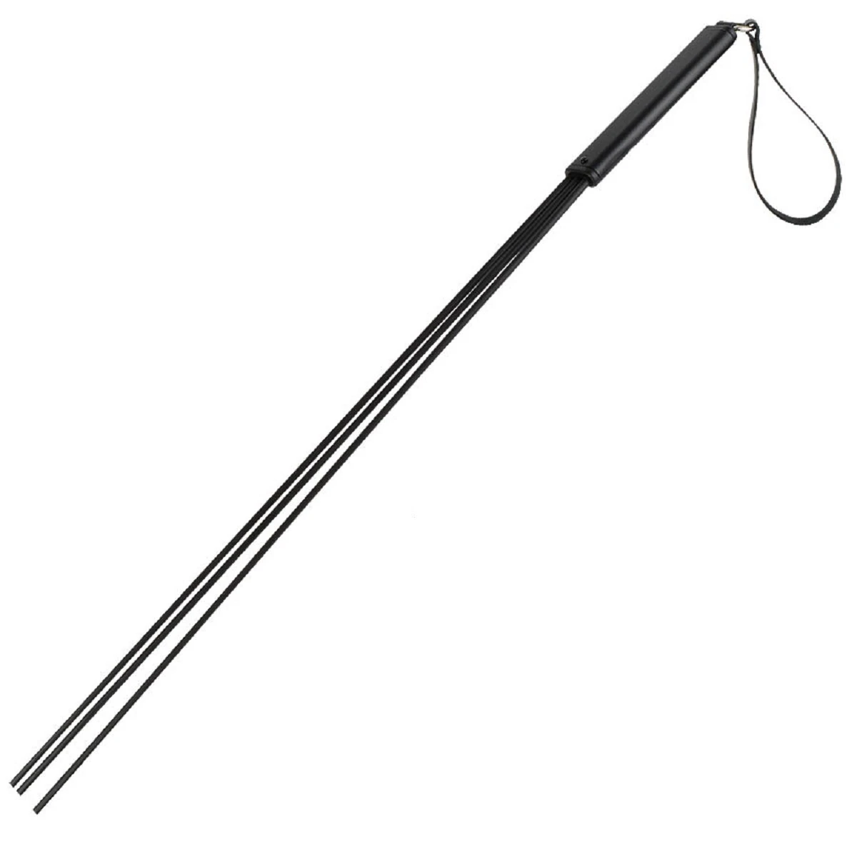 Стек розги состоит из металлической вороненой рукояти и 3-х полимерных хлыстов, покрытых натуральным латексом. Общая длина 62см. Цвет черный