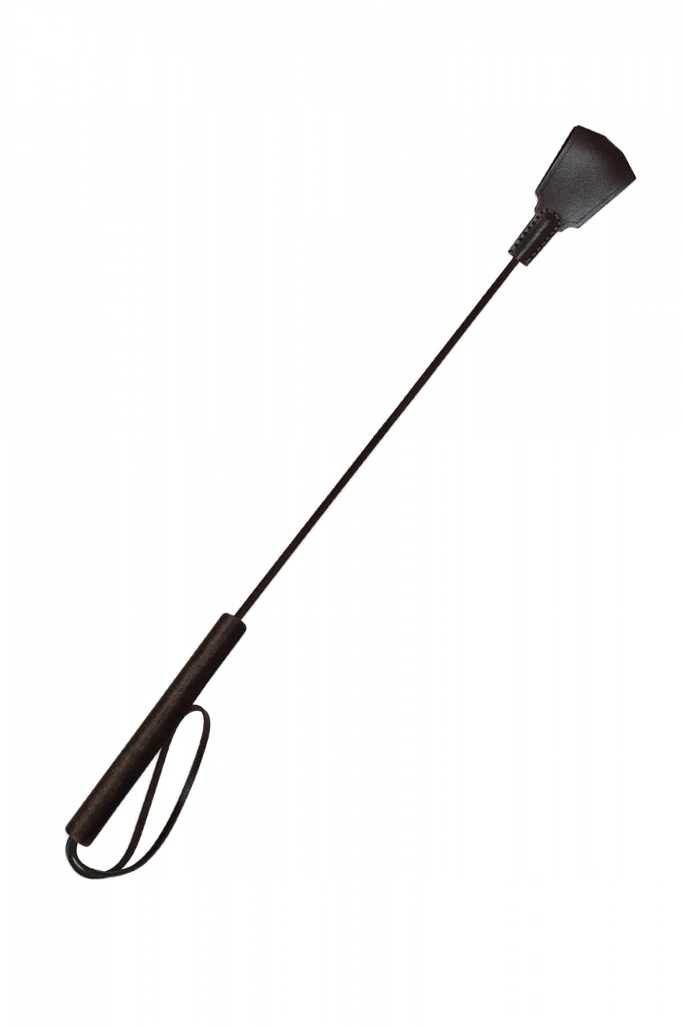 Стек из серии Готика представлен в виде роскошного, изящного изделия цвета темного шоколада. Петлеобразная хлопушка стека изготовлена из натуральной кожи высокого качества, располагается на конце гибкого, но прочного хлыста. Комфортное использование девайса обеспечивает бархатистая рукоять, покрытая велюровой тканью. Ремешок-петля, находящийся на рукояти, позволяет дополнительно фиксировать стек на запястье. Размер: длина 77 см, длина рукояти 16 см без темляка, длина хлопушки 13 см.