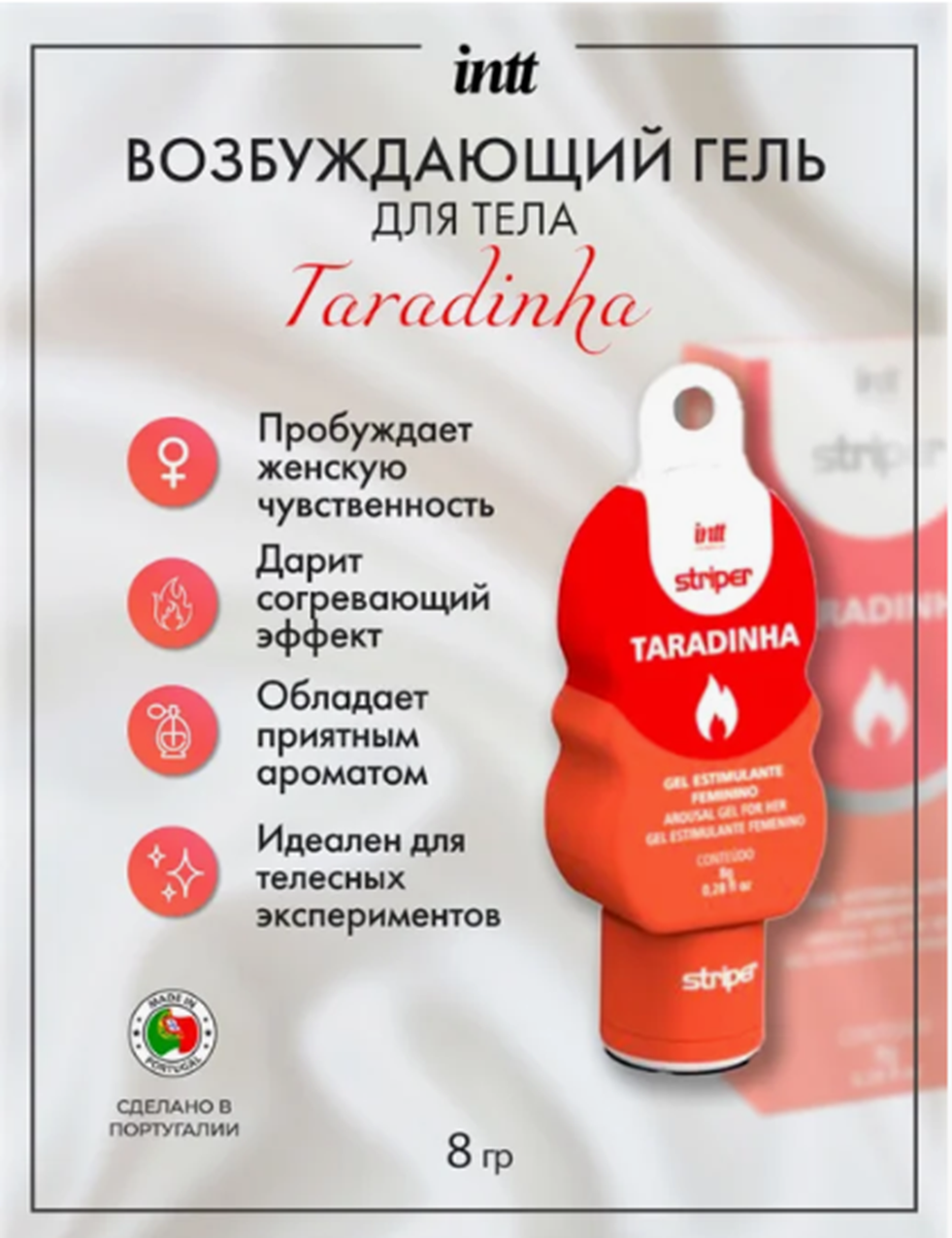 Гель Intt Taradinha зажигает так же сильно, как звуки одноименной песни. Согревающий эффект проявляется во время трения эрогенных зон с нанесенным средством. Гель усиливает ощущения от прикосновений и наполняет близость новыми нотками.