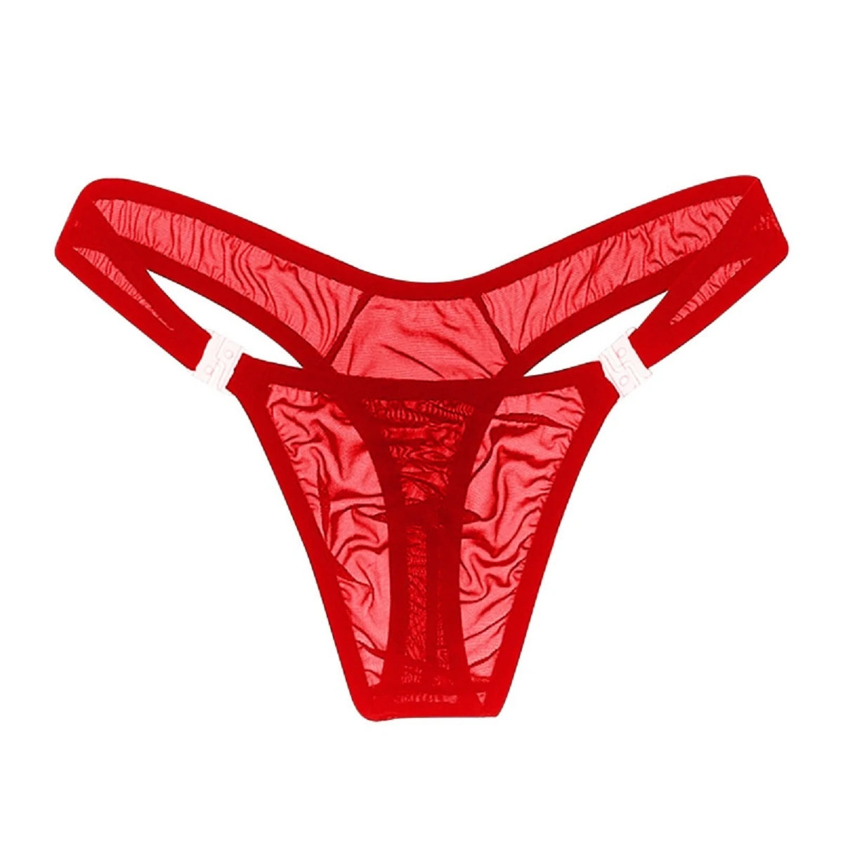 Мужские стринги из тонкой сеточки. Простой, удобный и элегантный крой. Перед отстегивается с помощью пластиковых карабинов, которые выполняют еще и декоративную функцию. Состав: хлопок 60%, эластан 40%. Цвет красный. Размер M/L (46-48).