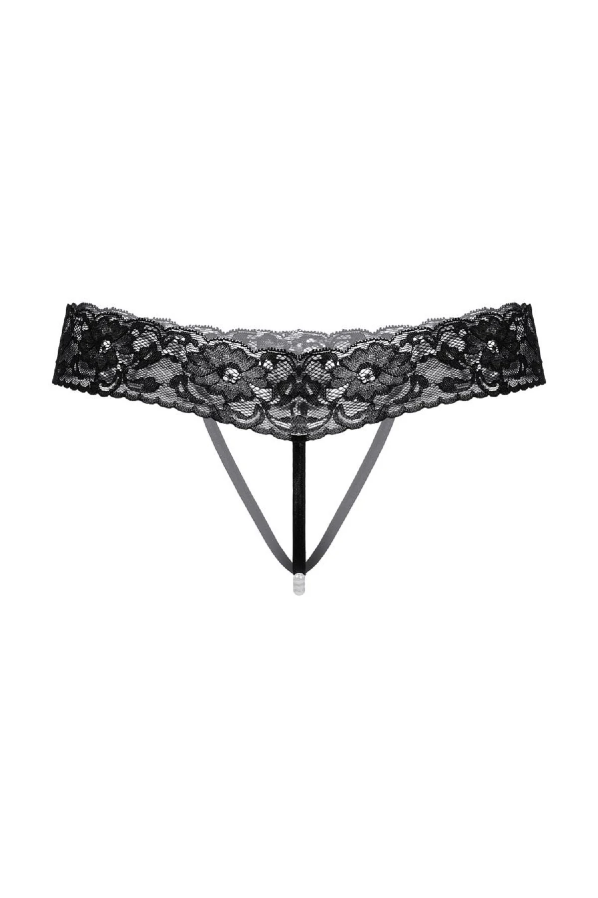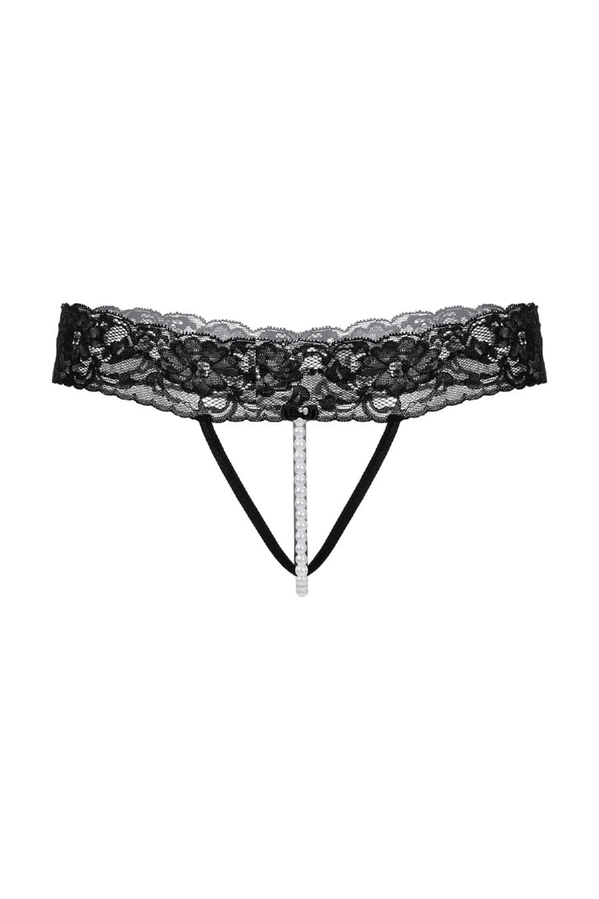 Кружевные стринги с открытым доступом. Спереди декорированы кокетливым бантиком и нитью жемчуга. Оригинальная кружевная резинка подчеркивает линию бедер. Цвет - черный. Размер - S\M.