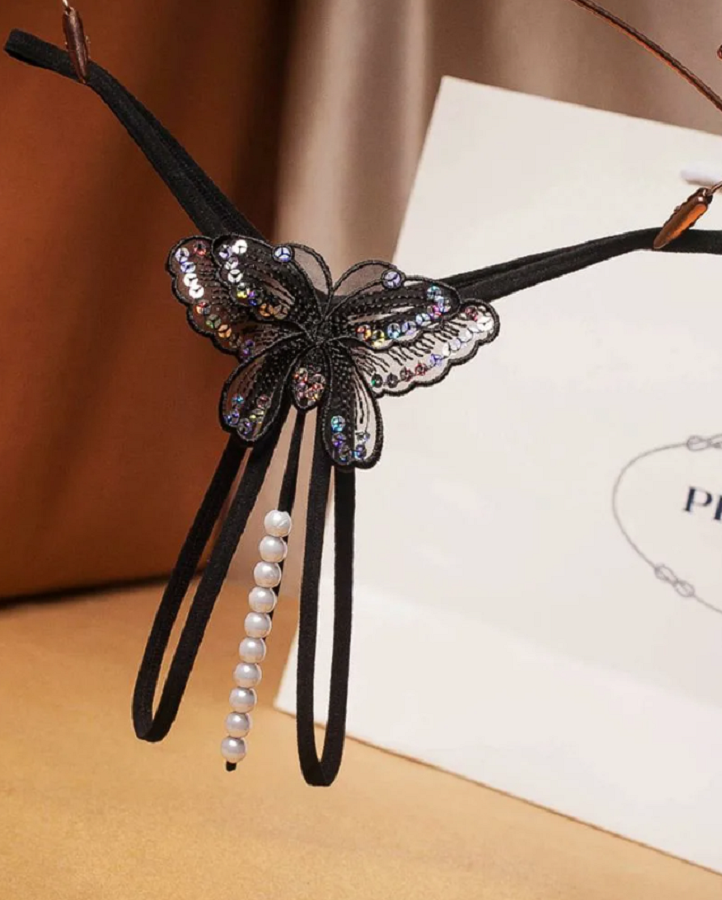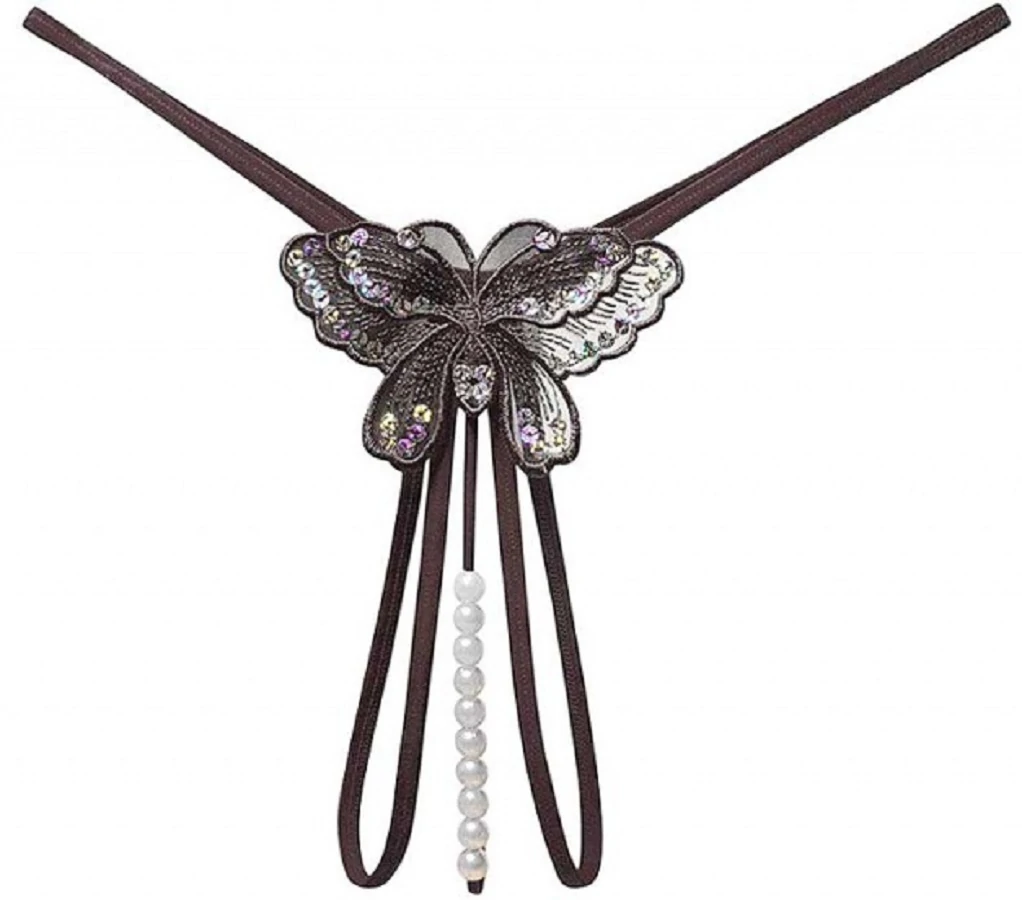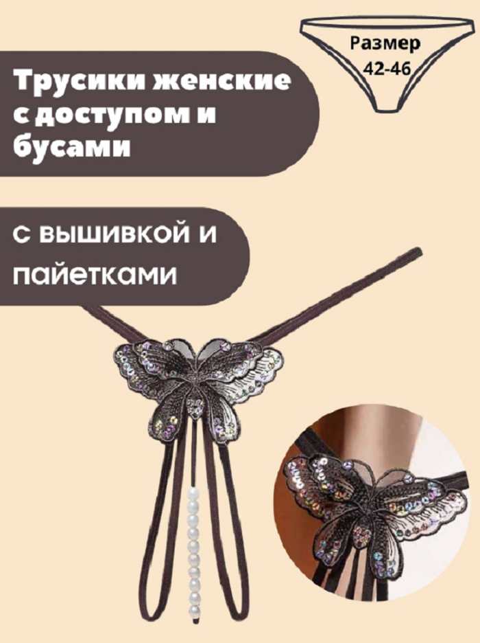 Минималистичные трусики-стринги с жемчужными бусинами. Перед декорирован кружевной бабочкой с вышивкой и пайетками. Цвет черный. Размер: S(42-44).