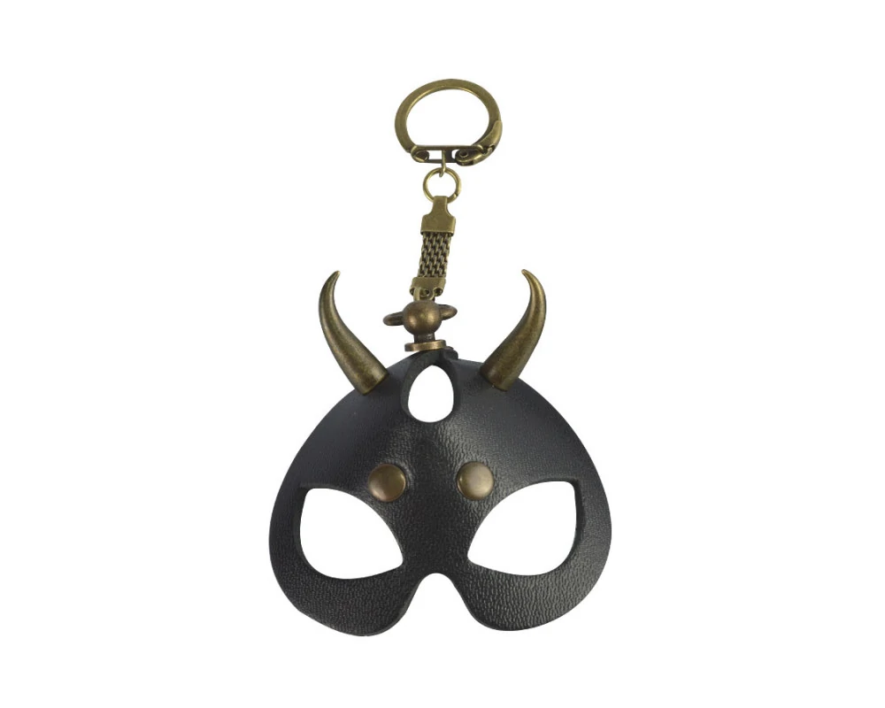 Оригинальный и забавный сувенир-подвеска – это миниатюрное изделие в форме маски Чертика. Подвеска изготовлена из натуральной кожи и украшена клепками и рожками. Необычная маска BDSM может служить автомобильной подвеской, украшением для сумки, а так же приятным презентом для Ваших друзей и знакомых. Общая длина около 7 см, ширина 7 см. Цвет черный.