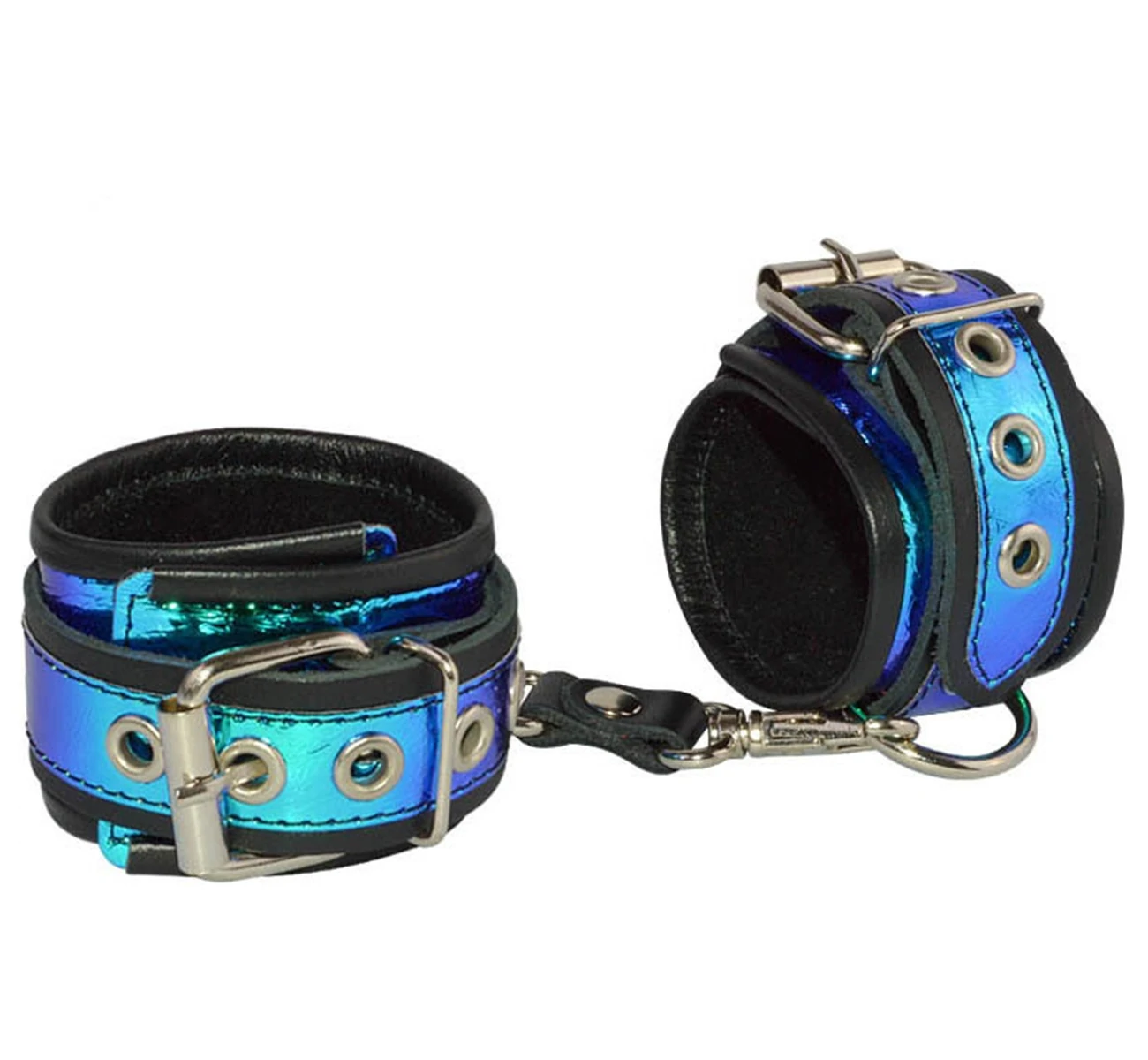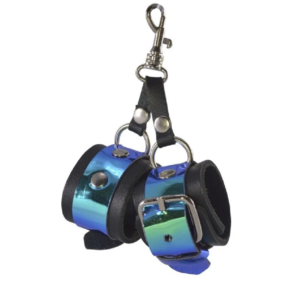 Оригинальный и забавный сувенир-подвеска – это миниатюрное изделие в форме наручников. Подвеска изготовлена из натуральной кожи и украшена лентой из искусственной кожи цвета хамелеон. Необычные «наручники BDSM» может служить автомобильной подвеской, украшением для сумки, а так же приятным презентом для Ваших друзей и знакомых. Общая длина около 14 см, ширина - 2,8 см. Цвет черный.