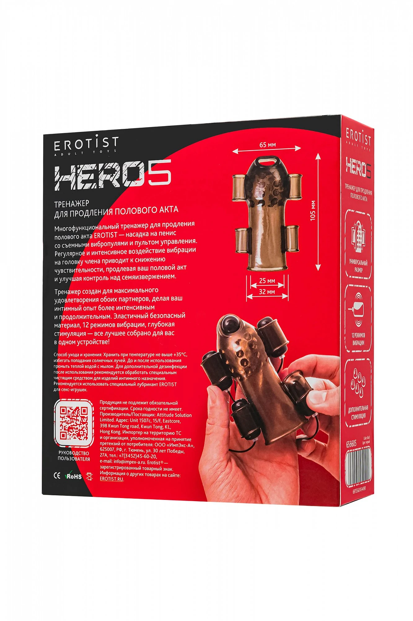 Тренажер для продления полового акта Erotist Hero 5 - насадка на пенис со съемными вибропулями и пультом управления. Регулярное и интенсивное воздействие вибрации приводит к временному снижению чувствительности, продлевая ваш половой акт и улучшая контроль над семяизвержением. Тренажер создан для максимального удовлетворения обоих партнеров, делая ваш интимный опыт более интенсивным и продолжительным. Эластичный безопасный материал, 12 режимов вибрации, глубокая стимуляция - все лучшее собрано для вас в одном устройстве! Кроме тренировок для продолжительности полового акта, тренажер также может использоваться как насадка для клиторальной стимуляции, стимуляции сосков, ануса и любых эрогенных зон. Это расширяет возможности мастурбации и прелюдии с партнером. Для мгновенного эффекта: наденьте насадку перед половым актом на эрегированный пенис на промежуток времени от 5 до 10 минут. Это позволит увеличить время полового акта до 50%.