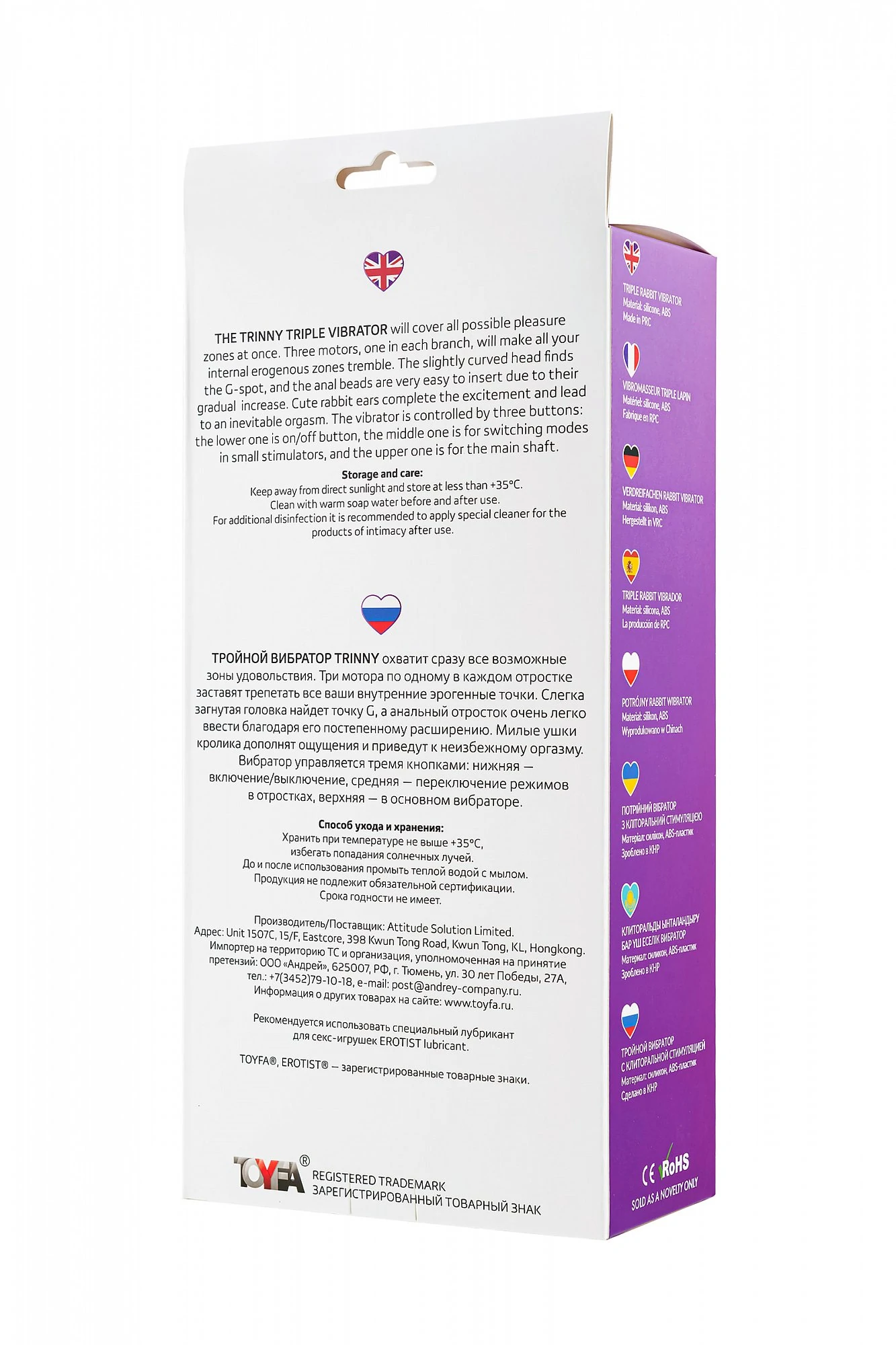 Тройной вибратор Trinny охватит сразу все возможные зоны удовольствия. Три мотора по одному в каждом отростке заставят трепетать все ваши внутренние эрогенные точки. Слегка загнутая головка найдет точку G, а анальный отросток очень легко ввести благодаря его постепенному расширению. Милые ушки кролика дополнят ощущения и приведут к неизбежному оргазму. Вибратор управляется тремя кнопками: нижняя - включение/выключение, средняя - переключение режимов в отростках, верхняя - в основном вибраторе. Материал: силикон. 10 режимов вибрации. Для более комфортного использования рекомендуем приобрести смазку на водной основе и очищающий спрей Clear Toy 100 мл для обработки изделия.