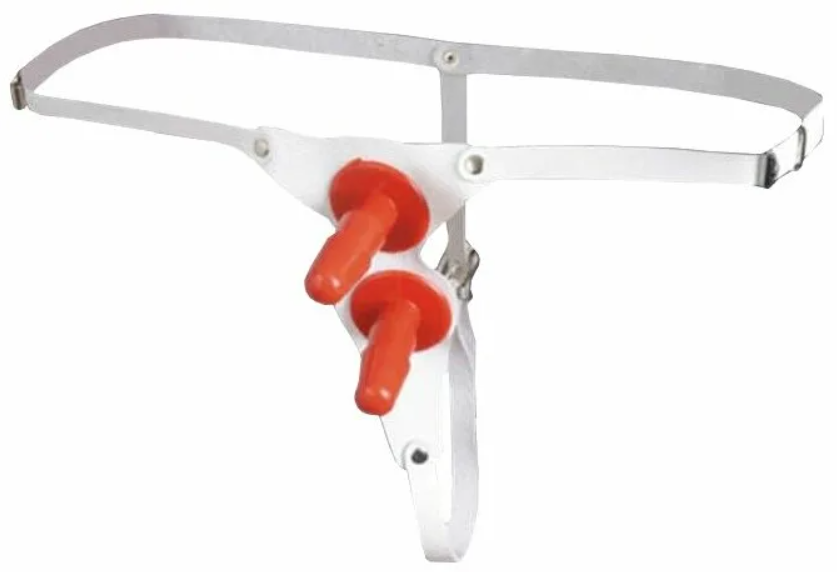 Трусики Харнесс. Изготовлены из натуральной кожи. При производстве используется никелированная фурнитура. Размер регулируется ремешками, которые крепятся на бёдрах (от 42 до 50 размера). В комплект входят два съёмных пластиковых плага (штырька) для возможности использования двух насадок одновременно (длина 68 мм). Идеально подходит для использования, как мужчиной, так и женщиной. Цвет: белый.