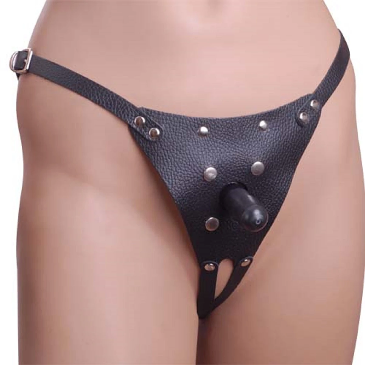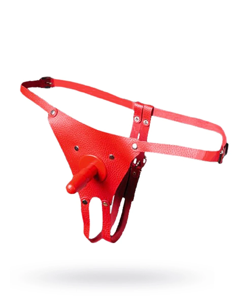 Изготовлены из натуральной кожи. При производстве используется никелированная фурнитура. Размер регулируется ремешками, которые крепятся на бёдрах. от 42 до 50 размера. В комплект входит съёмный пластиковый плаг для насадок длиной 6,8 см. Идеально подходит для использования, как мужчиной, так и женщиной. Цвет: красный.