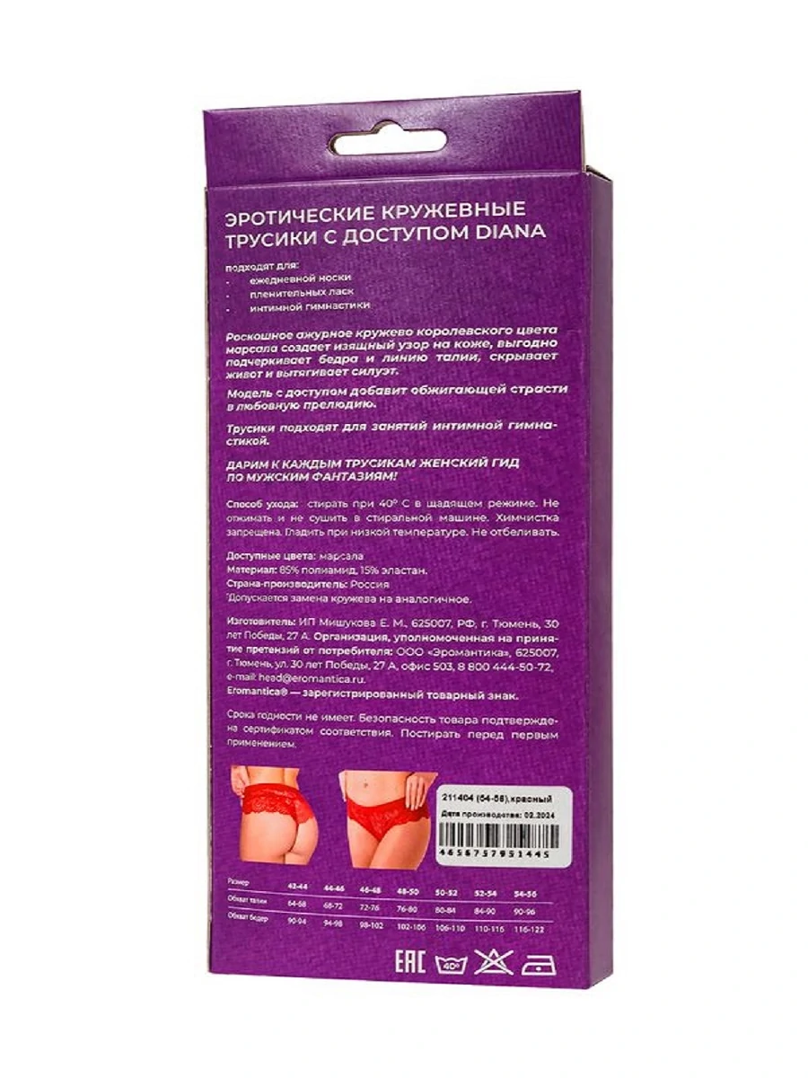 Эротические кружевные трусики Diana с доступом для ежедневной носки пленительных ласк интимной гимнастики. Роскошное ажурное кружево королевского цвета марсала создает изящный узор на коже, выгодно подчеркивает бедра и линию талии, скрывает живот и вытягивает силуэт. В модели предусмотрен скрытый доступ, что добавит обжигающей страсти в любовную прелюдию. Трусики подходят для занятий интимной гимнастикой. Размер: 46-48. Цвет: красный.