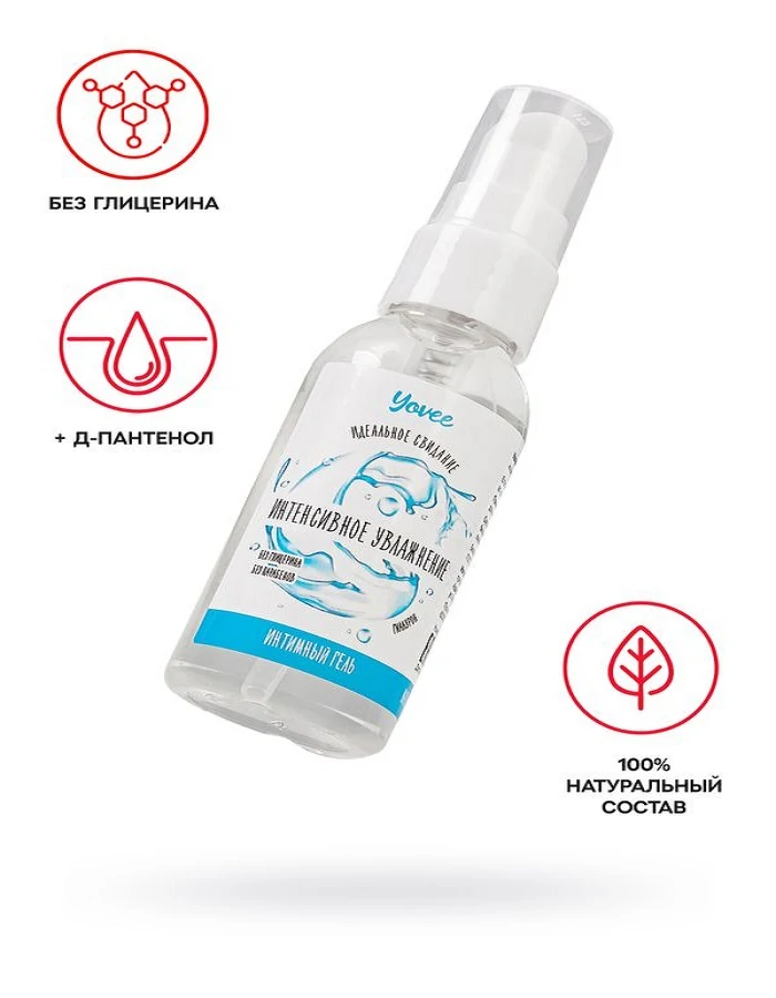 Интимный гель Yovee Интенсивное увлажнение восполняет уровень естественной смазки, создает мягкое и комфортное скольжение без ощущения липкости. Благодаря натуральному составу смягчает и увлажняет, улучшает эластичность кожи и слизистой, снимает раздражение, устраняет сухость влагалища. Легко смывается водой, не оставляет следов на одежде и постельном белье. Подходит как для вагинального, так и для орального секса. Совместим со всеми видами презервативов и игрушек для взрослых. Простой и безопасный состав: вода, гиалуроновая кислота и Д-пантенол препятствуют потере влаги, защищают слизистые, запускают процесс регенерации тканей. Гидроксиэтилцеллюлоза стабилизатор эмульсий, регулятор вязкости. Бензоат натрия, сорбат калия и лимонная кислота - консерванты. Объем: 50 мл.