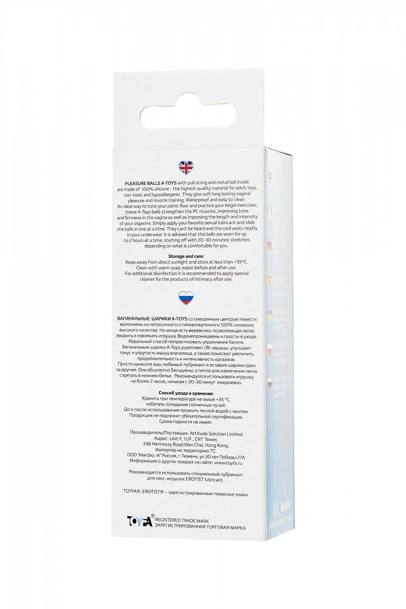 Вагинальные шарики A-Toys со смещенным центром тяжести выполнены из нетоксичного и гипоаллергенного 100% силикона высокого качества. На конце есть веревочка, позволяющая легко вводить и извлекать игрушку. Водонепроницаемы и просты в уходе. Идеальный способ попрактиковать упражнения Кегеля. Вагинальные шарики А-Toys укрепляют ЛК-мышцы, улучшают тонус и упругость мышц влагалища, а также помогают увеличить продолжительность и интенсивность оргазмов. Просто нанесите ваш любимый лубрикант и вставьте шарики один за другим. Они абсолютно бесшумны, а петлю для извлечения легко спрятать в нижнем белье. Рекомендуется использовать игрушку не более 2 часов, начиная с 20-30 минут ежедневно. Размер: длина 19 см, рабочая длина 10 см. диаметр 3 см.