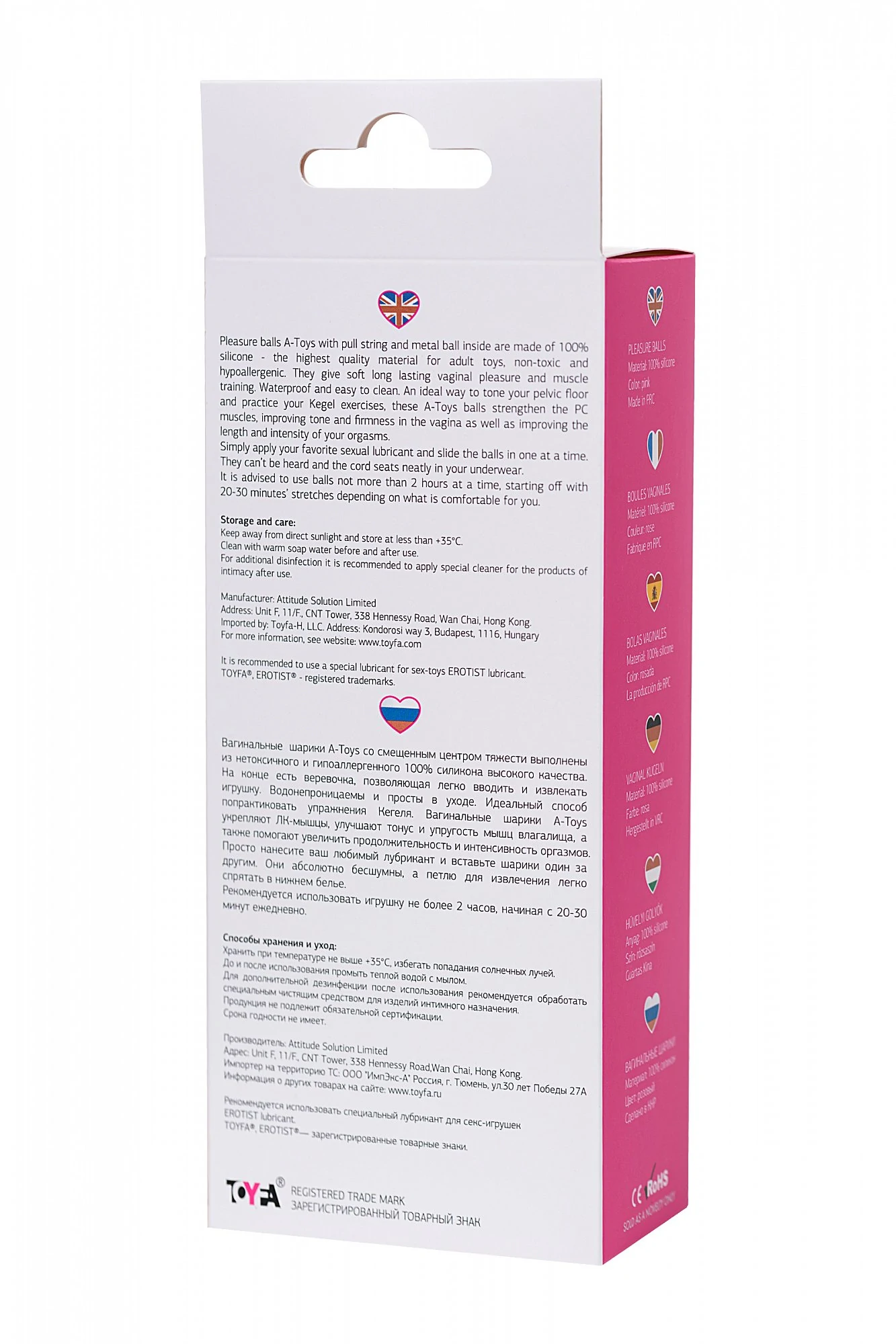 Вагинальные шарики A-Toys Rai со смещенным центром тяжести выполнены из нетоксичного и гипоаллергенного 100% силикона высокого качества. На конце есть веревочка, позволяющая легко вводить и извлекать игрушку. Водонепроницаемы и просты в уходе. Идеальный способ попрактиковать упражнения Кегеля. Вагинальные шарики А-Toys укрепляют ЛК-мышцы, улучшают тонус и упругость мышц влагалища, а также помогают увеличить продолжительность и интенсивность оргазмов. Просто нанесите ваш любимый лубрикант и вставьте шарики один за другим. Они абсолютно бесшумны, а петлю для извлечения легко спрятать в нижнем белье. Рекомендуется использовать игрушку не более 2 часов, начиная с 20-30 минут ежедневно. Для более комфортного использования рекомендуем приобрести специальный гель для вумбилдинга (фитнеса интимных мышц) Intim Fitness для женщин 50 гр и очищающий спрей Clear Toy 100 мл.