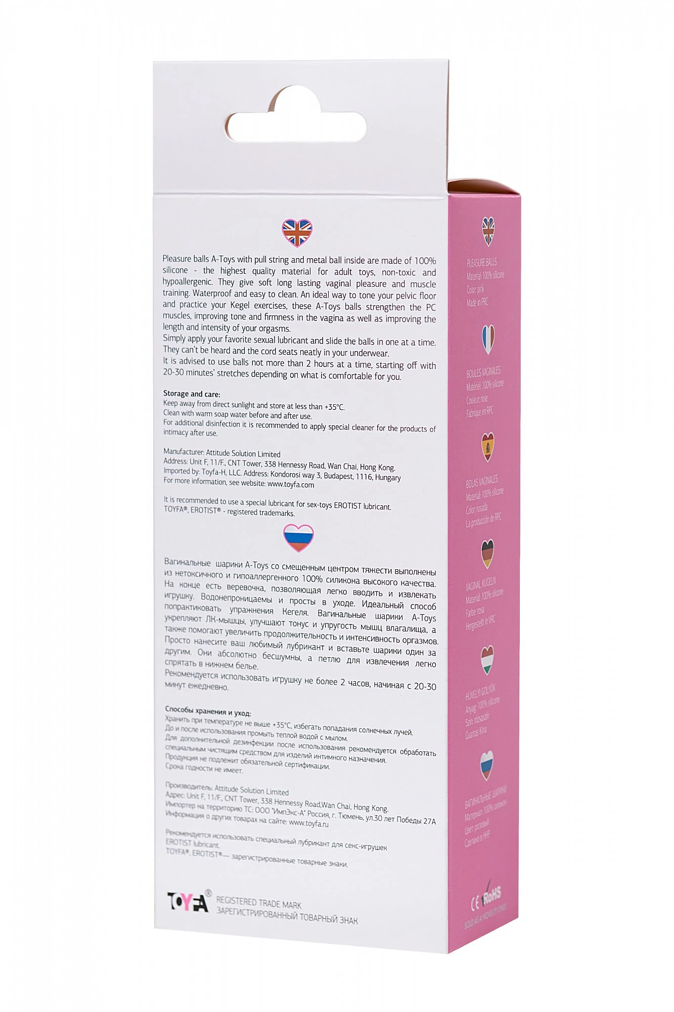 Вагинальные шарики A-Toys со смещенным центром тяжести выполнены из нетоксичного и гипоаллергенного 100% силикона высокого качества. На конце есть веревочка, позволяющая легко вводить и извлекать игрушку. Водонепроницаемы и просты в уходе. Идеальный способ попрактиковать упражнения Кегеля. Вагинальные шарики А-Toys укрепляют ЛК-мышцы, улучшают тонус и упругость мышц влагалища, а также помогают увеличить продолжительность и интенсивность оргазмов. Просто нанесите ваш любимый лубрикант и вставьте шарики один за другим. Они абсолютно бесшумны, а петлю для извлечения легко спрятать в нижнем белье. Рекомендуется использовать игрушку не более 2 часов, начиная с 20-30 минут ежедневно. Размер: длина 17 см, диаметр 3,1 см. Для более комфортного использования рекомендуем приобрести специальный гель для вумбилдинга (фитнеса интимных мышц) Intim Fitness для женщин 50 гр и очищающий спрей Clear Toy 100 мл.