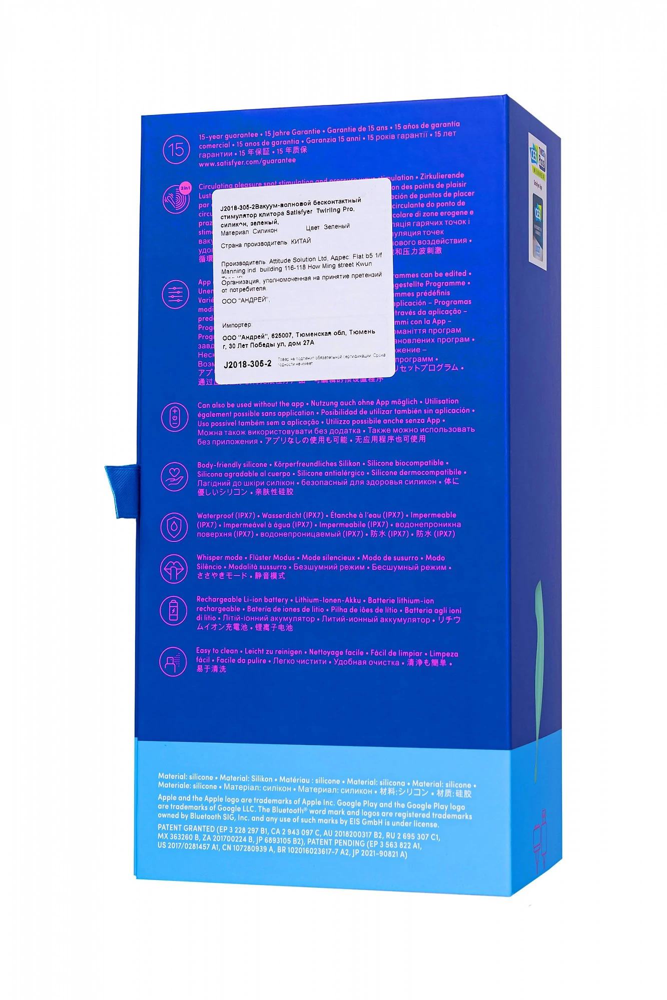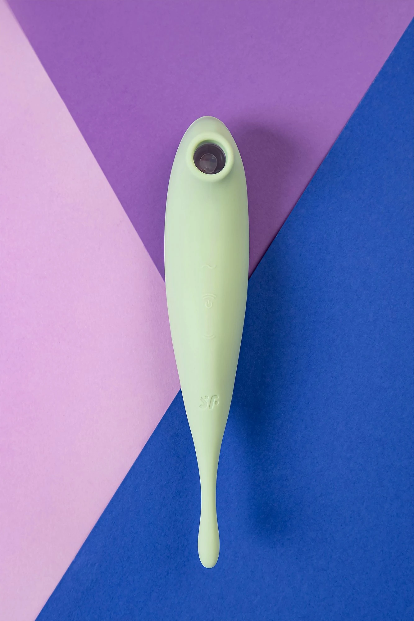 Нежнейшая клиторальная стимуляция и дразняще-вибрирующий наконечник: знакомьтесь, это новинка от Satisfyer двусторонний Twirling pro. С одной стороны игрушки раструб для клитора, воздействующий на сокровенное воздушными волнами. Twirling pro обладает 11 режимами интенсивности, по которым как по ступенькам вы пройдете от чувственных ласк до умопомрачительного оргазма. С другой стороны удлиненный кончик совершает циркулирующие точечные движения в разнообразных паттернах вибрации, которых имеется 12 режимов. Деликатное воздействие на все известные и еще неизвестные эрогенные зоны обеспечивает овальная форма упругого наконечника. Легкие щекочущие ощущения или максимально интенсивные прикосновения, которые вам предстоит испытать на пути неземного блаженства.