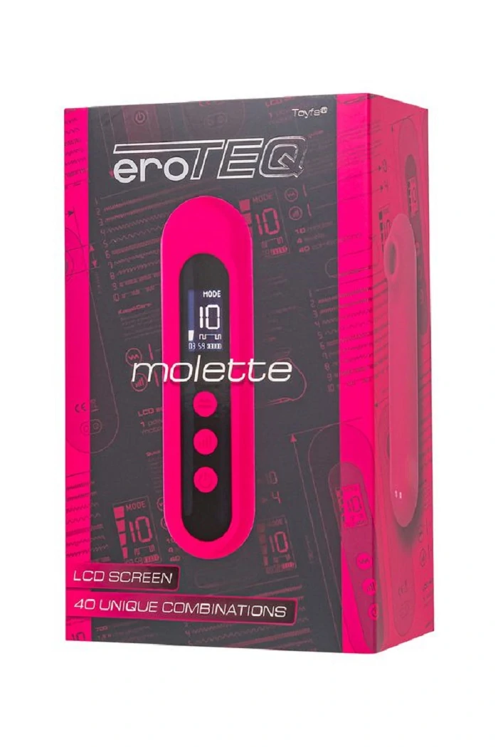 Встречайте вакуум-волновой стимулятор клитора Molette от eroTeq. С 10 режимами стимуляции и 4 уровнями мощности каждого режима, Molette предлагает целых 40 уникальных комбинаций, призванных подарить вам неповторимое наслаждение. Меняйте варианты и интенсивность воздействия на клитор и прокачивайте собственную чувствительность, открывая новые возможности вашего тела. Этот вакуумный аппарат продвигает бесконтактную стимуляцию на новый уровень. Lcd дисплей предоставляет вам полный контроль над процессом режимы вибрации, уровни мощности, время работы и заряд батареи. Molette удобно лежит в ладони, полная длина 130 мм, диаметр раструба составляет 1,3 см, что подходит большинству женщин. Возможности Molette позволяют вам наслаждаться моментами интимного блаженства с полной уверенностью и комфортом. Для более комфортного использования рекомендуем приобрести смазку на водной основе и очищающий спрей Clear Toy 100 мл для обработки изделия.