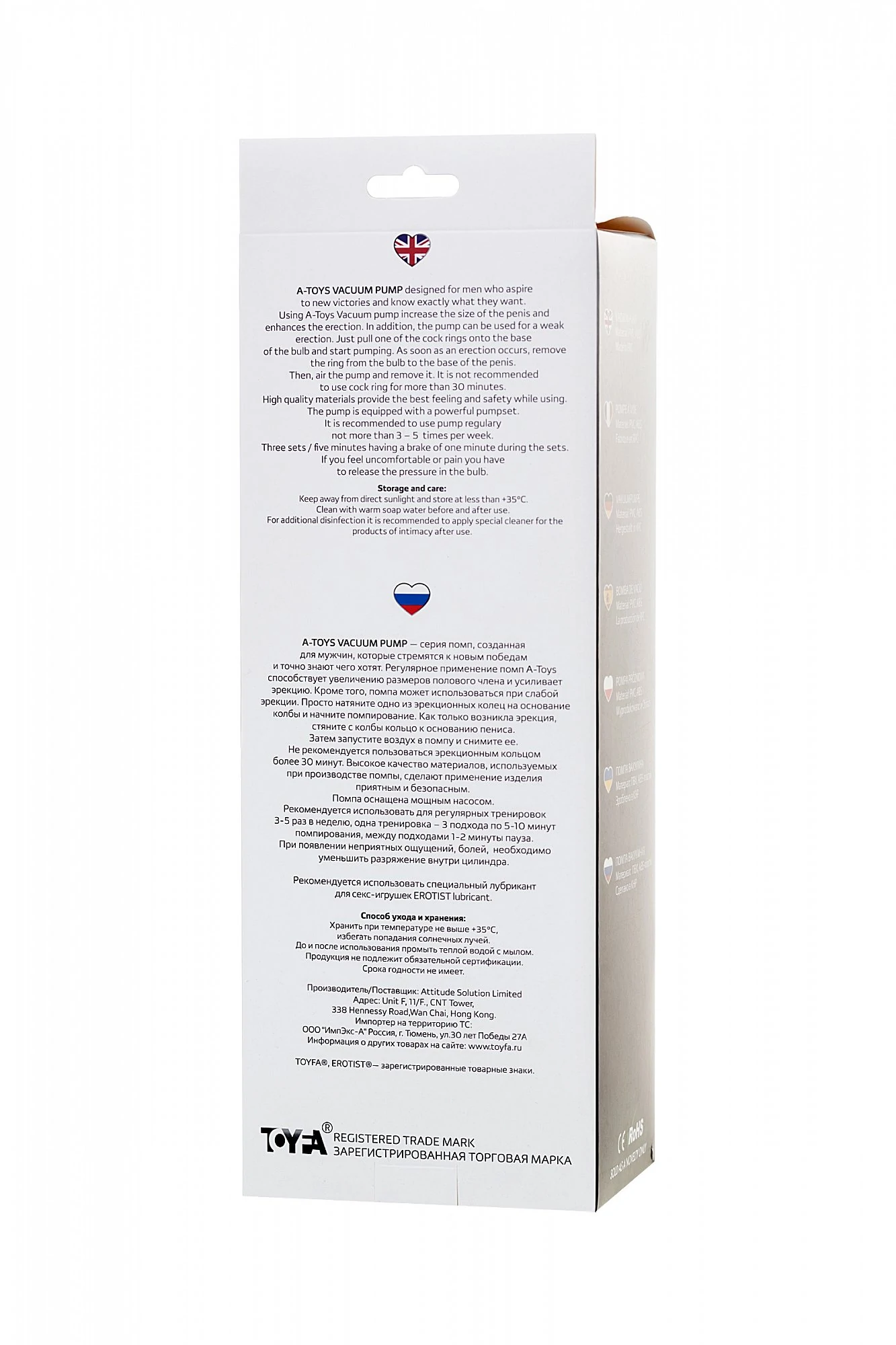 A-Toys Vacuum pump - серия помп, созданная для мужчин, которые стремятся к новым победам и точно знают чего хотя. Регулярное применение помп Atoys способствует увеличению размеров полового члена и усиливает эрекцию. Высокое качество материалов, используемых при производстве помпы, сделают применение изделия приятным и безопасным. Помпа оснащена мощным насосом. Размер: длина колбы 20,5 см, внешний диаметр 5,6 см, внутрений диаметр 3,7 см. Для более эффективного использования рекомендуем приобрести крем для мужчин "Big Pen"с которым вы достигнете максимального результата в Вашем стремлении к совершенству.