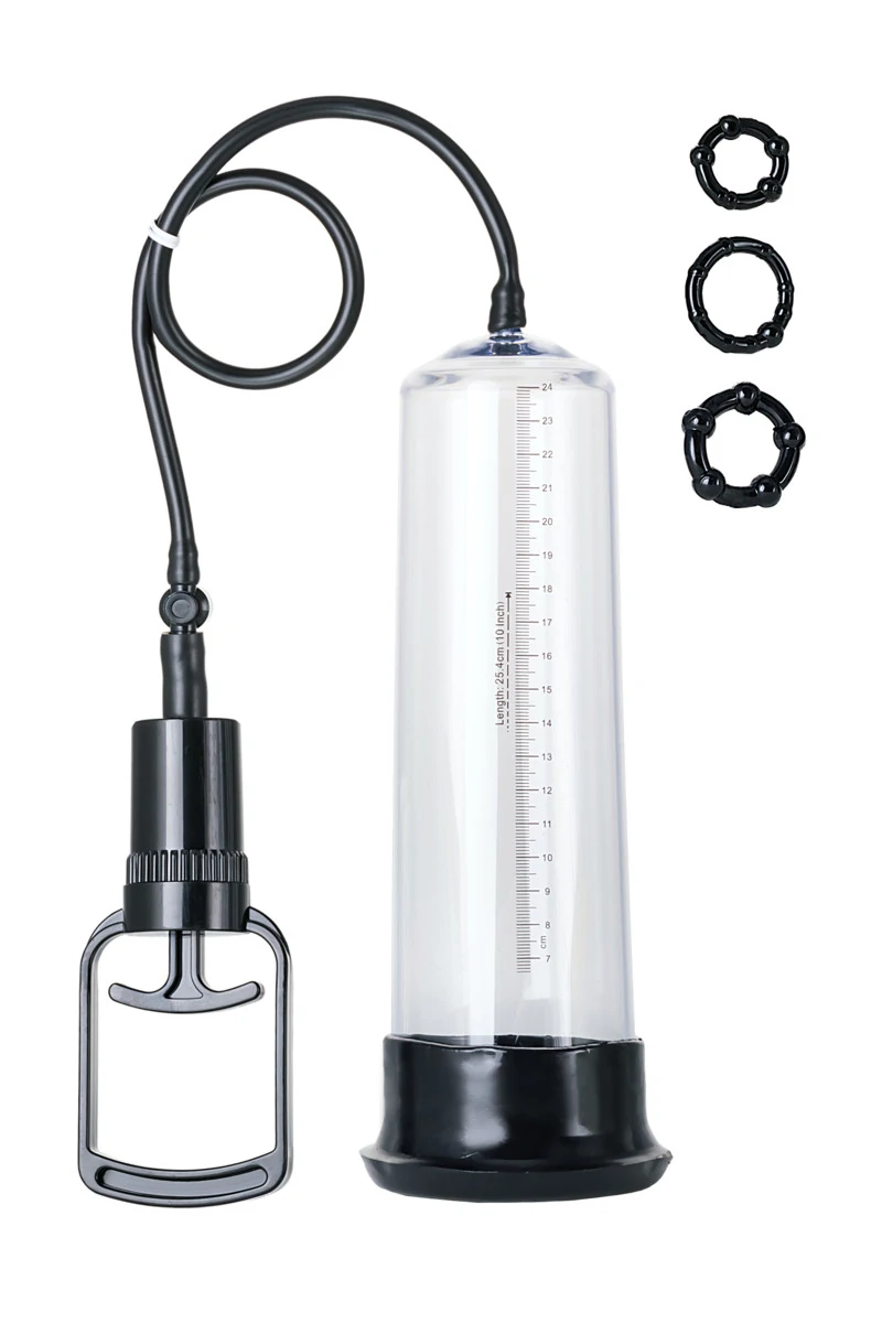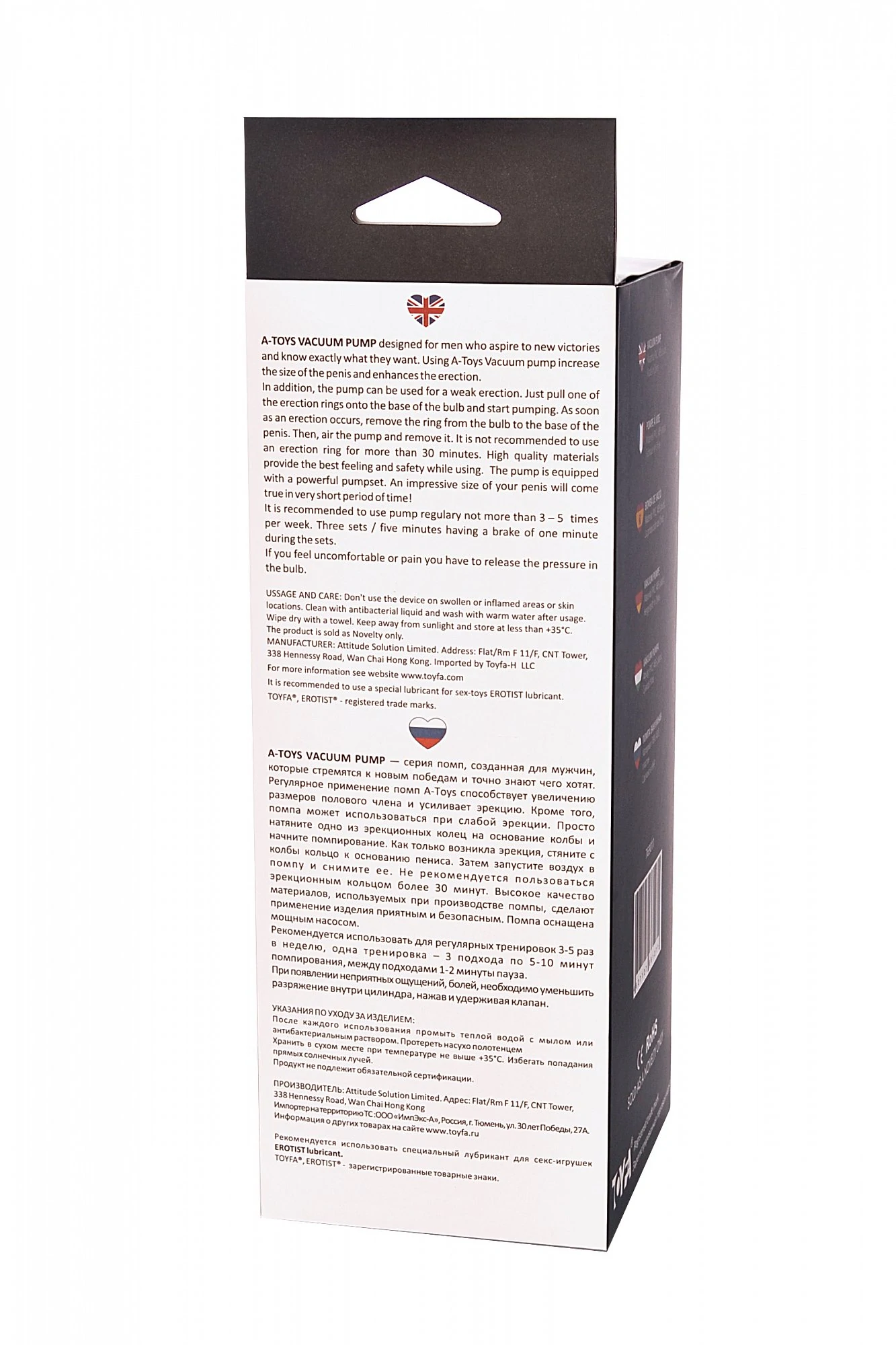 A-Toys Vacuum pump — серия помп, созданная для мужчин, которые стремятся к новым победам и точно знают чего хотя. Регулярное применение помп Atoys способствует увеличению размеров полового члена и усиливает эрекцию. Высокое качество материалов, используемых при производстве помпы, сделают применение изделия приятным и безопасным. Помпа оснащена мощным насосом. Размер: общая длина изделия 27,5 см, максимальный диаметр основания 7,1 см. Для более комфортного использования рекомендуем приобрести смазку на водной основе и очищающий спрей Clear Toy 100 мл для обработки изделия.