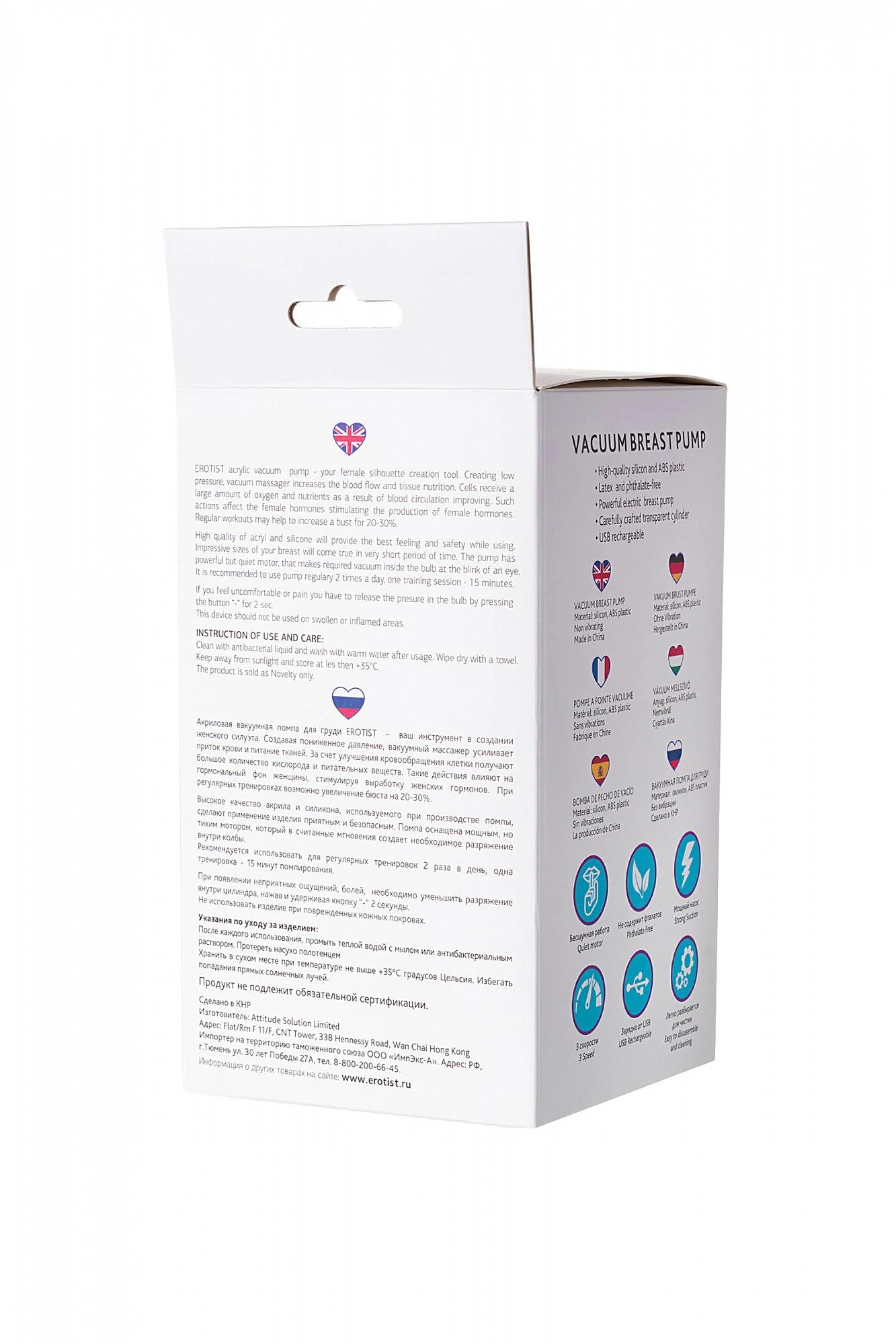 Акриловая вакуумная помпа для груди Erotist – ваш инструмент в создании женского силуэта. Создавая пониженное давление, вакуумный массажер усиливает приток крови и питание тканей. За счет улучшения кровообращения клетки получают большое количество кислорода и питательных веществ. Такие действия влияют на гормональный фон женщины, стимулируя выработку женских гормонов. При регулярных тренировках возможно увеличение бюста на 20-30%. Высокое качество акрила и силикона, используемого при производстве помпы, сделают применение изделия приятным и безопасным. Помпа оснащена мощным, но тихим мотором, который в считанные мгновения создает необходимое разряжение внутри колбы. Рекомендуется использовать для регулярных тренировок 2 раза в день, одна тренировка - 15 минут помпирования. При появлении неприятных ощущений, болей, необходимо уменьшить разряжение внутри цилиндра, нажав и удерживая кнопку “-“ 2 секунды. Не использовать изделие при поврежденных кожных покровах. Рабочая длина 14 см.